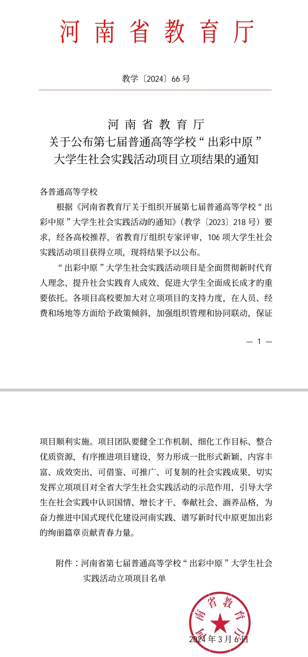 “出彩中原”大学生社会实践活动项目自启动以来,始终致力于全面贯彻新时代育人理念,通过社会实践这一重要途径,提升育人成效,促进大学生的全面成长成才。该活动不仅为大学生提供了认识国情、增长才干的机会,而且鼓励他们通过实践活动奉献社会、涵养品格。此次立项的106个项目,涵盖了文化传承、科技创新、乡村振兴、环境保护等多个领域