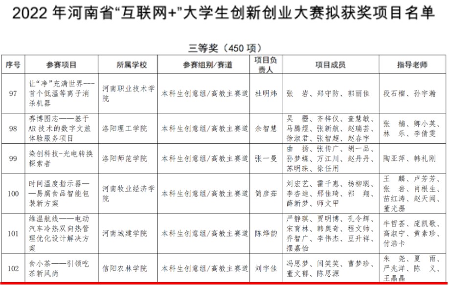 根据河南省教育厅等十一部门《关于举办2022年河南省“互联网+”大学生创新创业大赛暨第八届中国国际“互联网+”大学生创新创业大赛河南赛区选拔赛的通知》(教高〔2022〕156号)精神,按照河南省教育厅办公室《关于2022年河南省“互联网+”大学生创新创业大赛暨第八届中国国际“互联网+”大学生创新创业大赛河南赛区选拔赛系列活动的通知》(教高函〔2022〕327号)安排,经学校推荐、网络评审、现场评审,我院“食小茶”团队荣获三等奖。