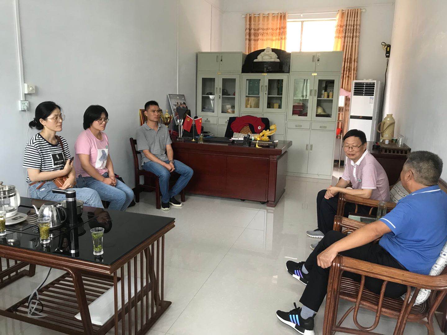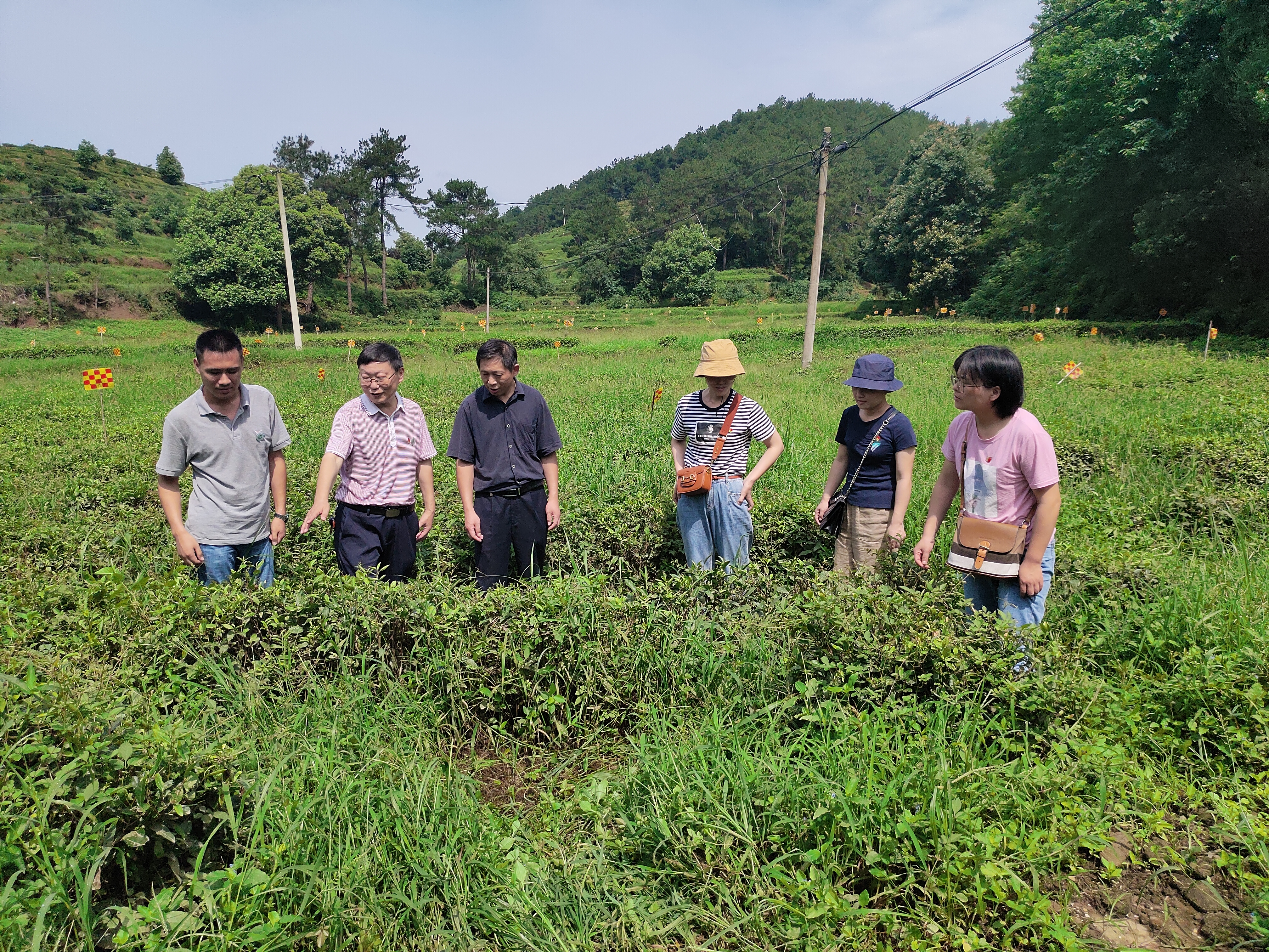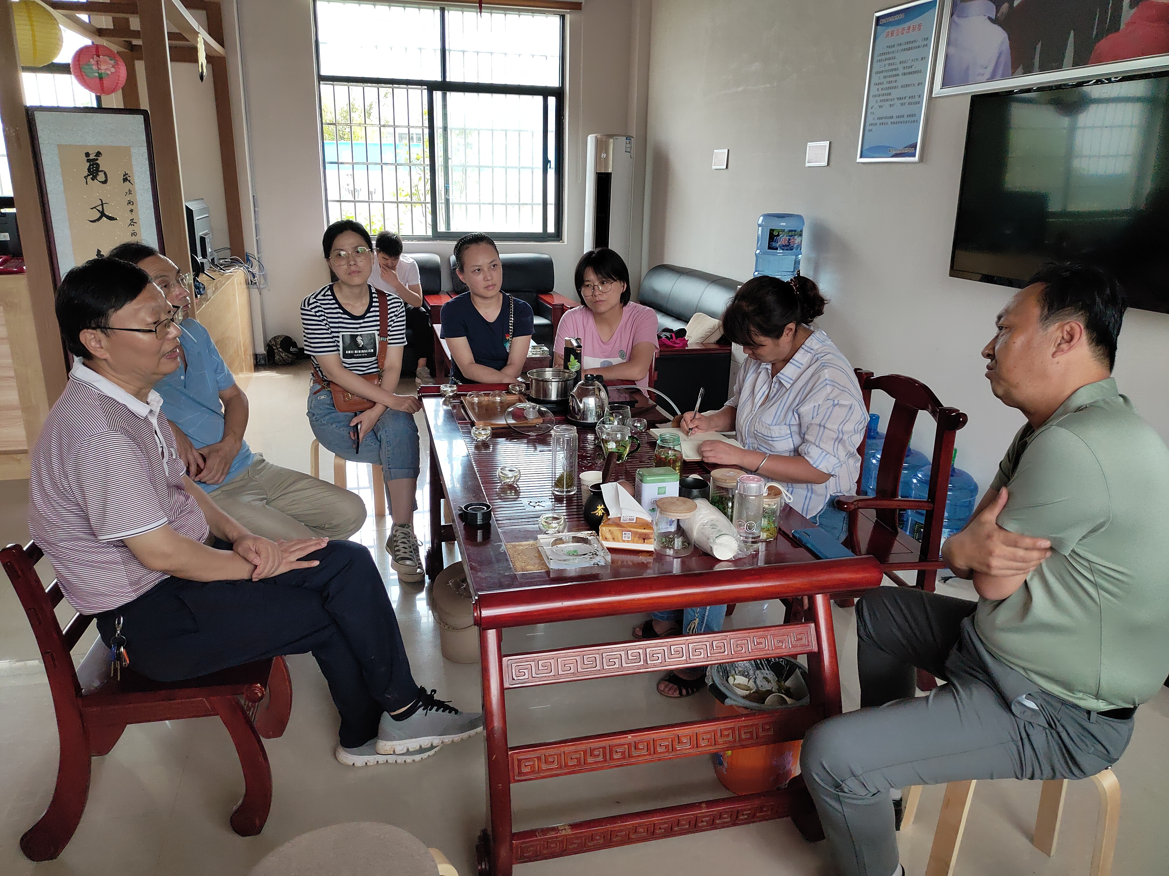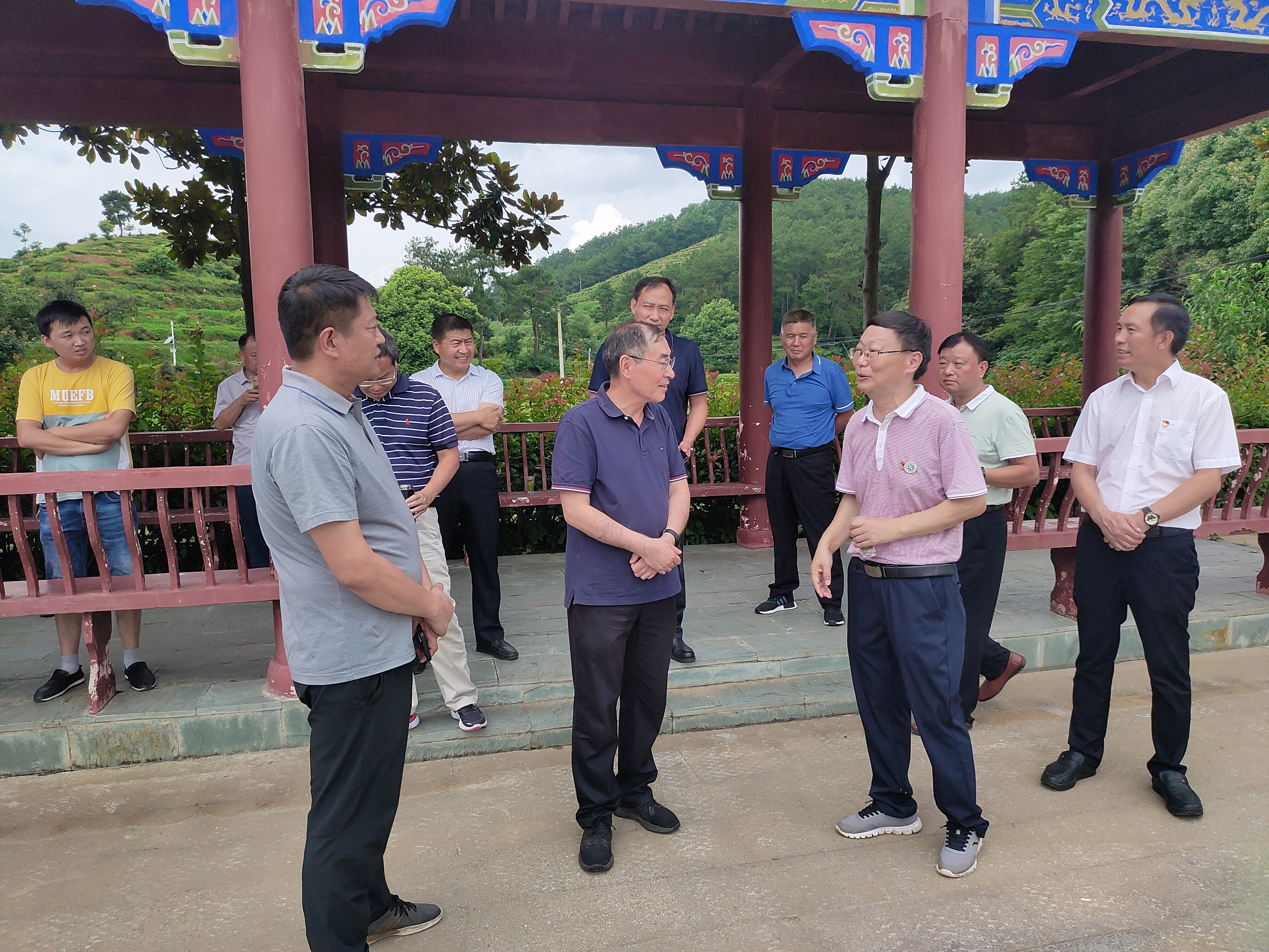 在净居寺茶场,团长郭桂义代表服务团向茶场工作人员赠送茶叶基本知识科普宣传册,与茶场负责人董益胜、书记曹璐就近期连日阴雨导致低洼茶园长势不佳、夏秋茶资源利用程度低、茶叶生产成本高企等问题进行交流并提出针对性建议。随后服务团团长郭桂义与到访茶场视察的省科技厅副厅长夏培臣汇报交流,夏厅长对服务团开展科技服务的方式与成效表示肯定,并建议多向茶农展示服务成果。