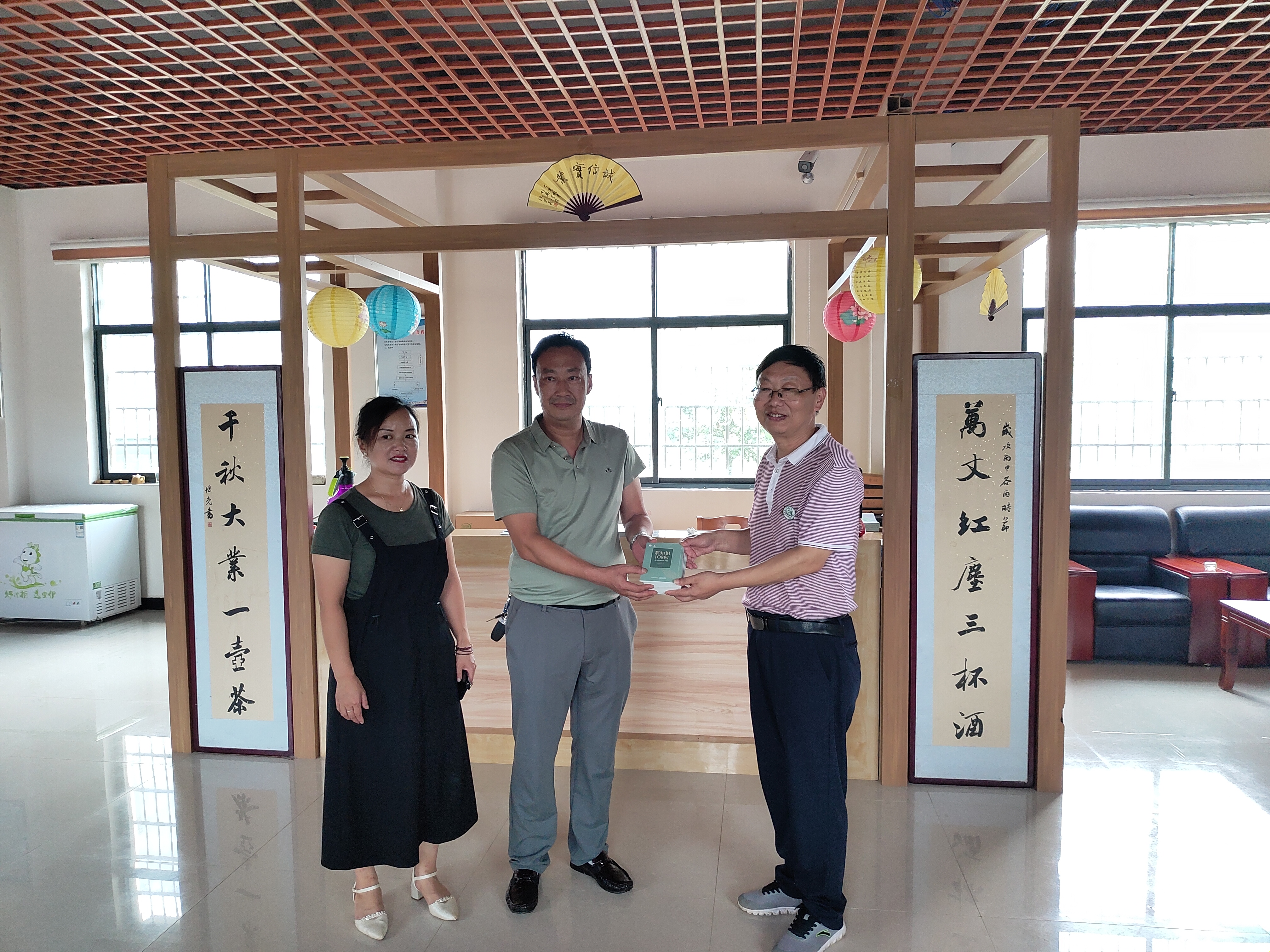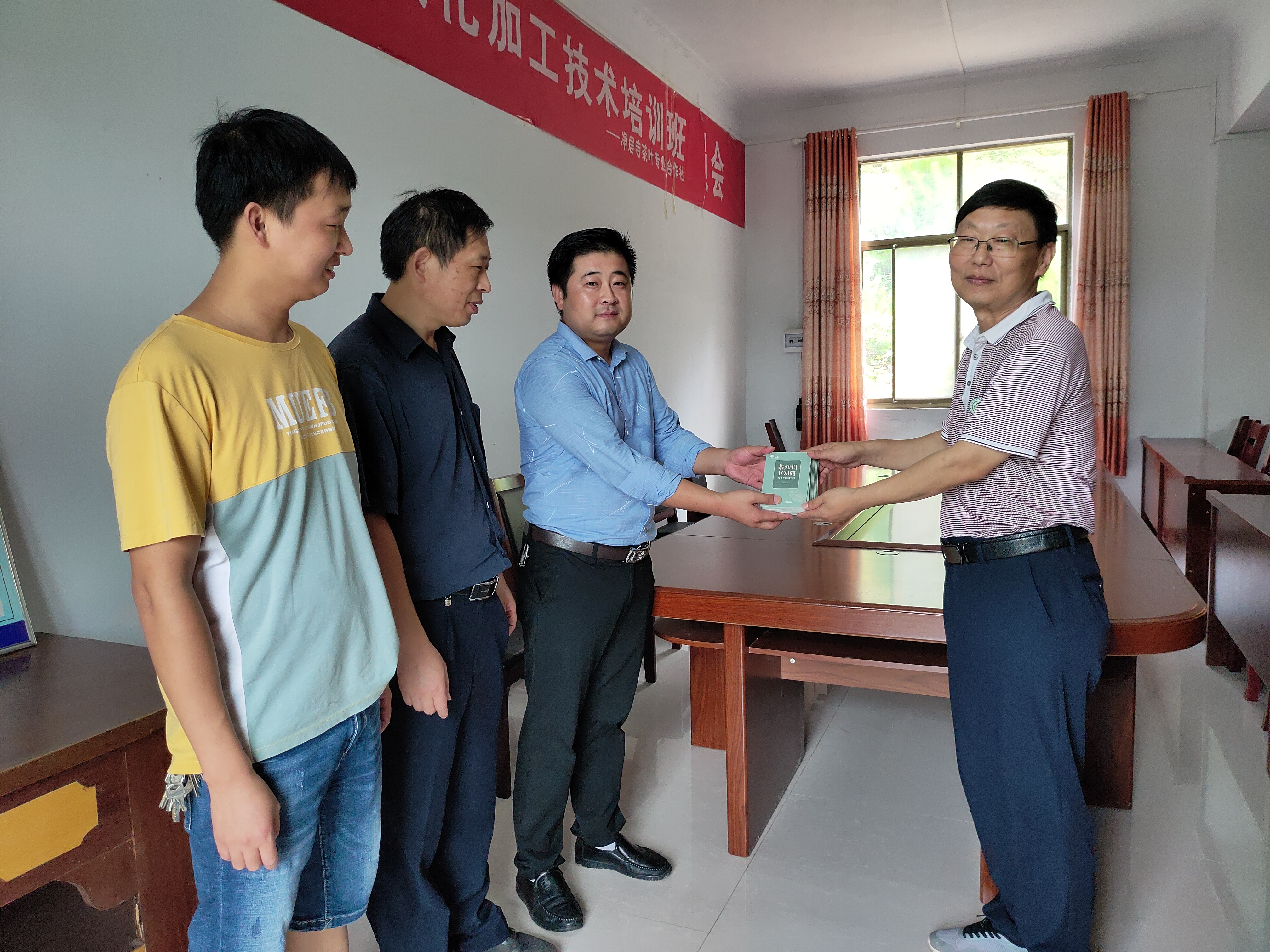 应光山诚信实业有限公司总经理陈勇邀请,服务团一行赶赴诚信公司,与光山县林茶局副局长张国善、公司总经理陈勇、茶叶加工厂负责人李家猛就企业关心的茶旅游资源开发与茶旅融合发展问题进行深入交流,提出建设茶叶博物馆、茶树品种示范园与茶叶观光基地、茶叶非物质文化遗产展示中心、茶叶体验中心、茶文化研学、科普与培训中心、茶餐、茶宿等旅游项目,将公司茶旅游项目建设成为集茶叶观光、体验、餐饮、住宿与茶文化培训一体的综合性茶旅游基地。通过交流,陈总表示受益匪浅,将按照专业建议整理落实制定方案。最后团长郭桂义向总经理陈勇和工作人员赠送茶叶基本知识科普宣传册