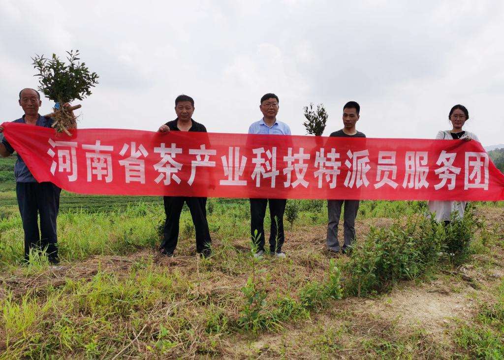 服务团成员听取了河南赛山悟道生态茶业科技有限公司董事长兼总经理匡祯超先生关于茶树品种栽培与管理现状的介绍,现场先后考察了中茶108、中茶111、浙农117、龙井43、槠叶齐、乌牛早、农抗早、金玫瑰、黄金叶、白毫早、信阳10号、中黄1号、中黄3号、中白1号、白叶1号、春雨1号、茂绿、劲峰等十八个茶树品种的生长现状与品种特征,探讨不同茶树品种的品质差异,为后续共同开展茶树品种的耐高温性和抗旱性研究奠定基础。