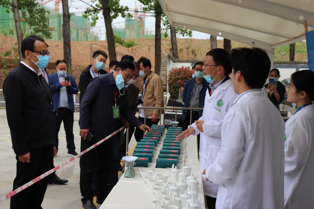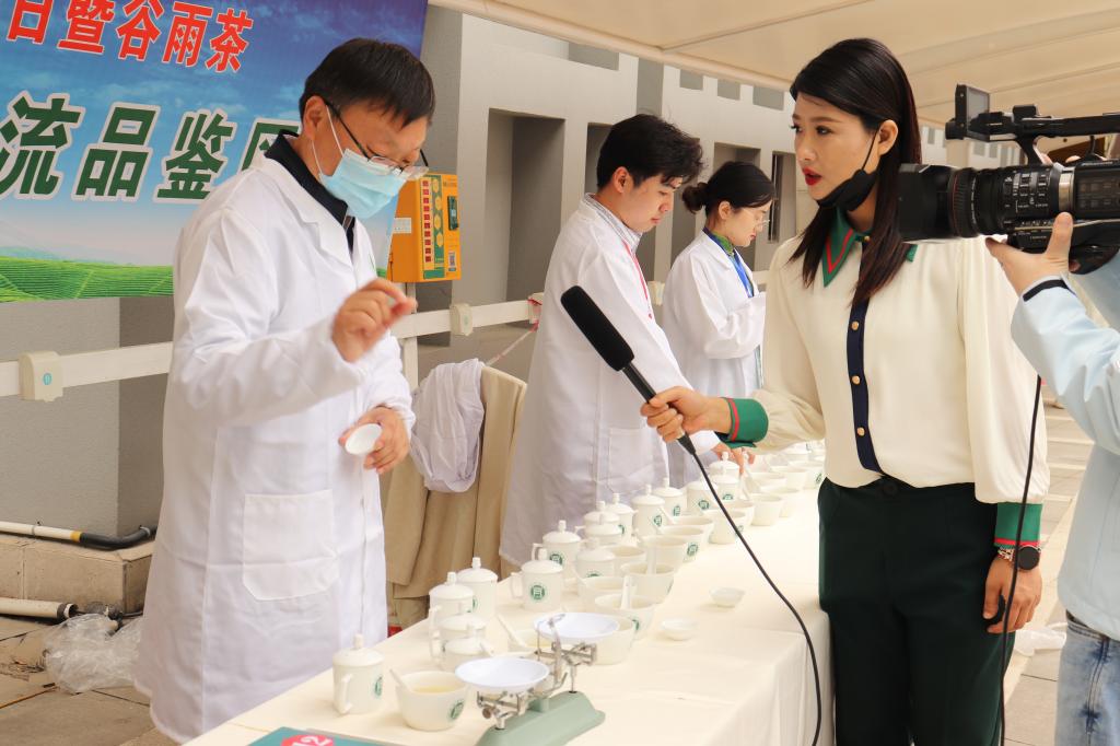 河南省茶产业科技特派员服务团团长郭桂义教授带领团队成员王杉、朱尧、王晶晶、卫艺炜等老师组成茶叶感官审评团队使用近5小时以客观公正的态度、采用专业的国家标准茶叶感官审评方法对“大众喜爱的信阳毛尖品鉴评比”的49个茶叶样品进行了盲评打分。郭教授在盲评时接受采访说到,评茶和品茶不一样,评茶是用标准统一的专业审评用具、茶水比、冲泡时间,以及统一的方法,客观公正地评价茶叶品质,可以更好的指导茶农、茶企茶叶生产。