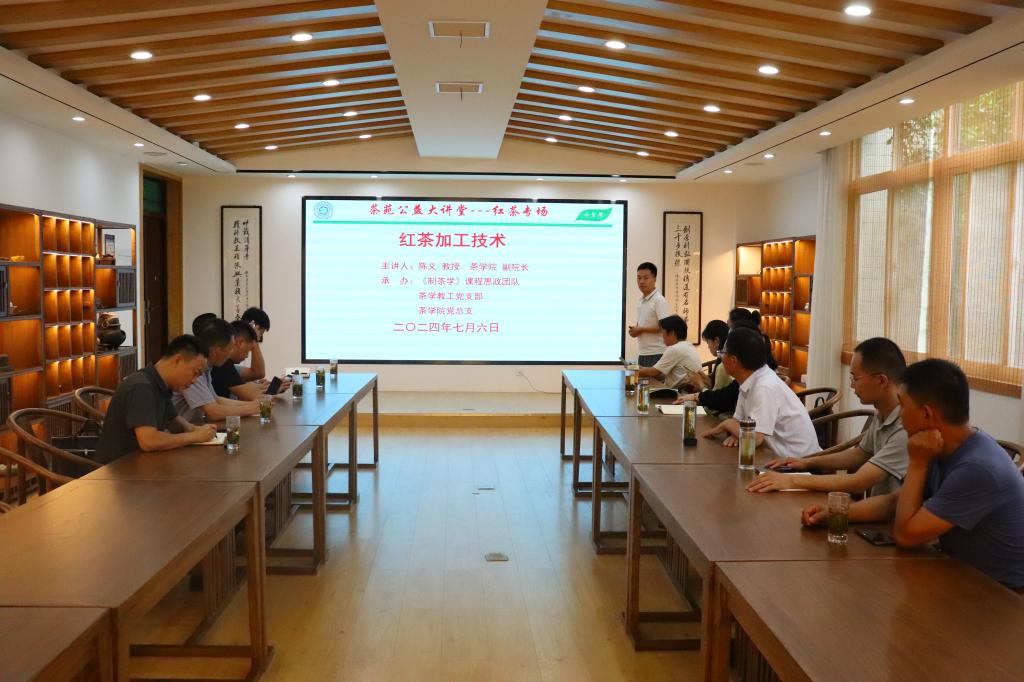 首先,陈义教授围绕红茶发展史、红茶分类、红茶品质特点、红茶初制技术理论、参数以及红茶创新工艺等内容进行1个多小时的授课,重点讲授了不同种类红茶的技术参数:茶鲜叶经萎凋、揉捻、发酵、过红锅、熏焙、干燥制作成小种红茶;经萎凋、揉捻、发酵、干燥制作而成的是工夫红茶;红碎茶则是经过萎凋、揉切、发酵和干燥制成。而后,围绕信阳当地实际情况讲授可以通过适当摊放、增加摇青、冷冻、过滚筒等创新性工艺,提升信阳红茶品质。郭桂义教授补充强调,红茶加工要重视萎凋技术细节和程度的把控,尽量减少萎凋过程叶子红变,不能有红茶萎凋叶子红变点没关系的意识;红茶不仅揉捻程度要求要重,揉捻速度也要快,保证发酵均匀。