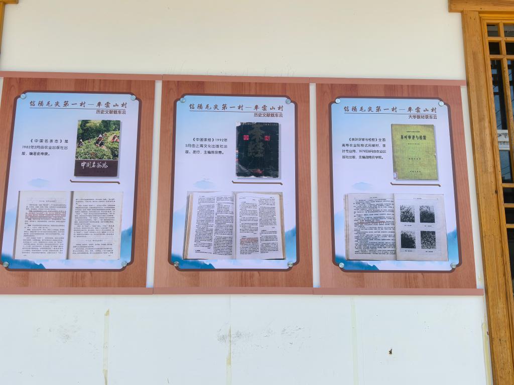 首先,郭桂义查看了在车云山村村委会由河南省茶产业科技特派员服务团提供技术和理论指导建设的“信阳毛尖茶第一村----车云山村”茶文化墙,文化墙主要展示了与车云山村有关的信阳毛尖茶文献对车云山信阳毛尖茶品质的评价,为“信阳毛尖茶第一村”这一品牌打造,提供支撑。郭桂义表示,找寻记载车云种茶、制茶的历史文献,挖掘车云山村茶文化历史,制作车云山茶文化展示展板等,能够有效促进车云山村茶产业的发展。
