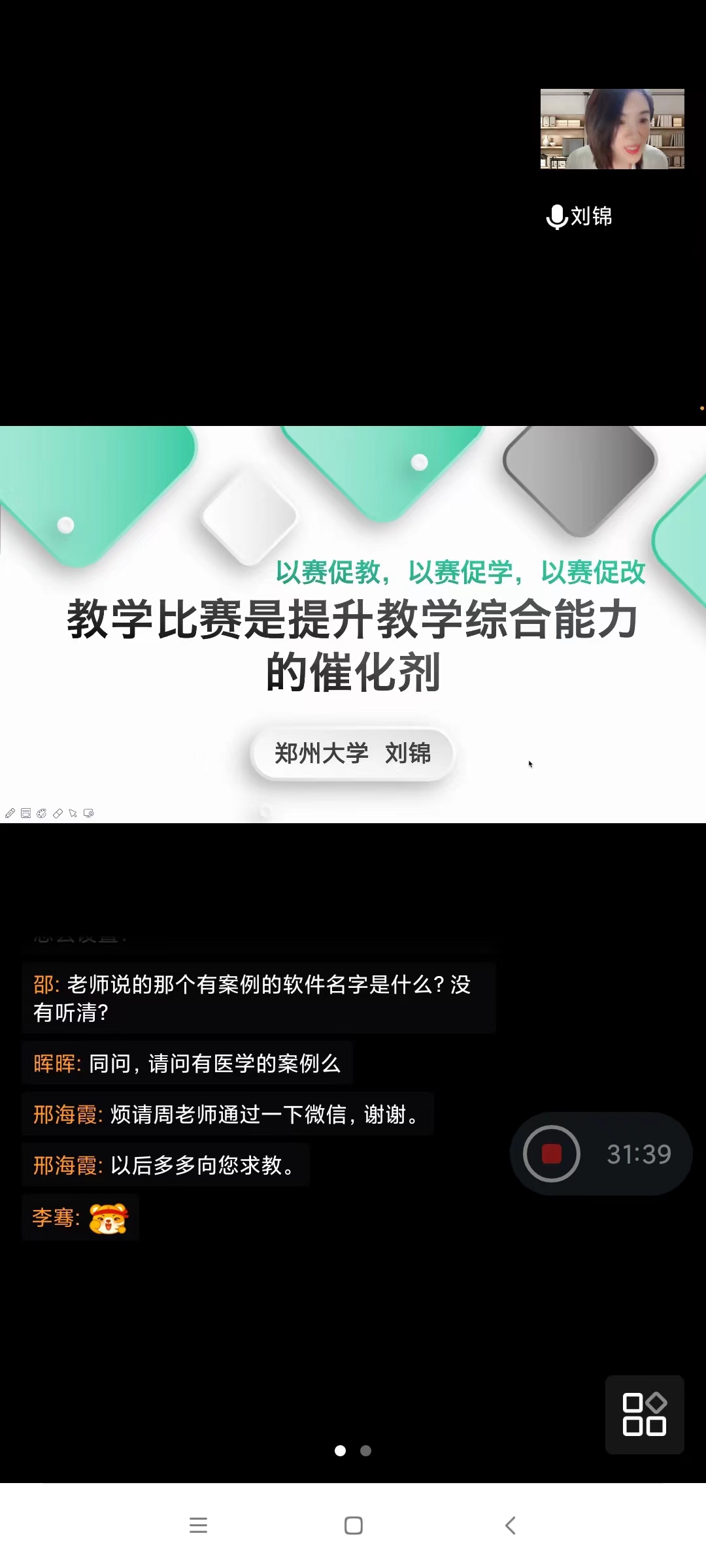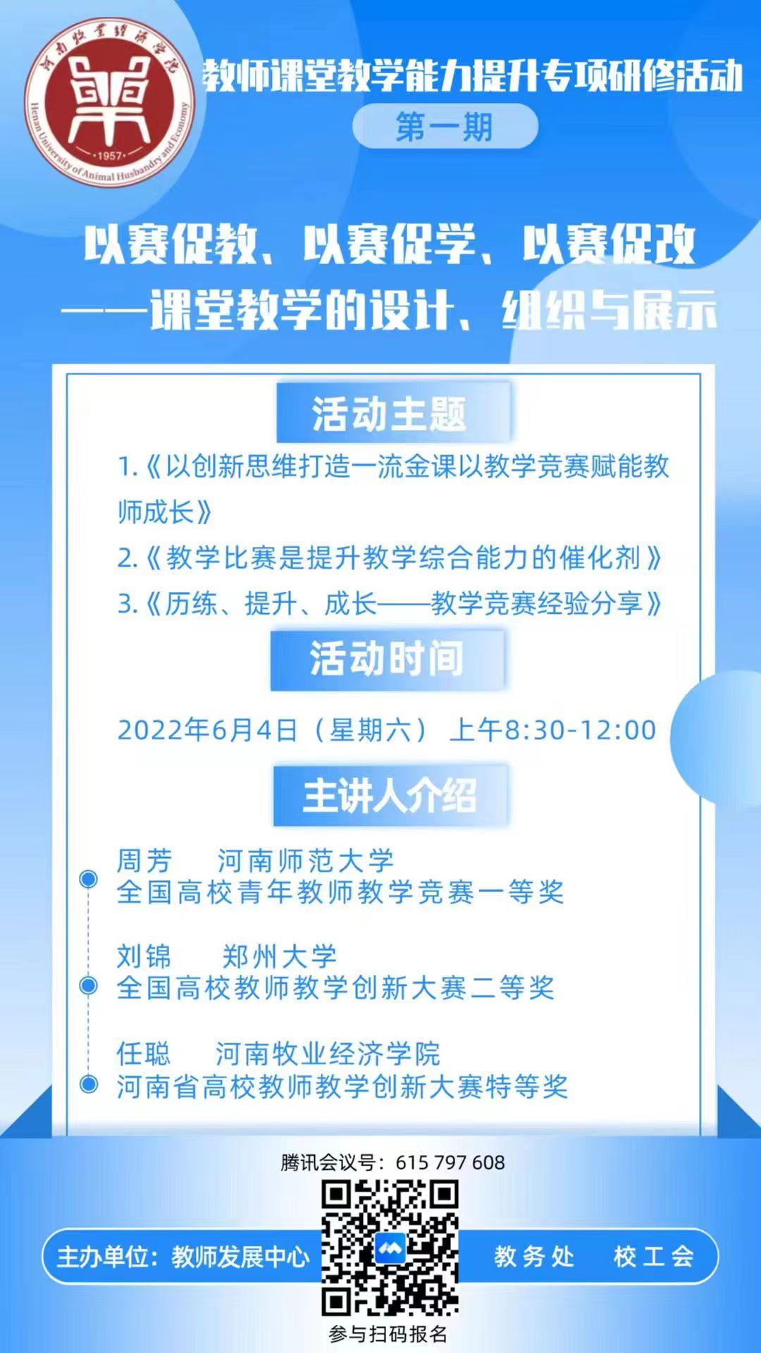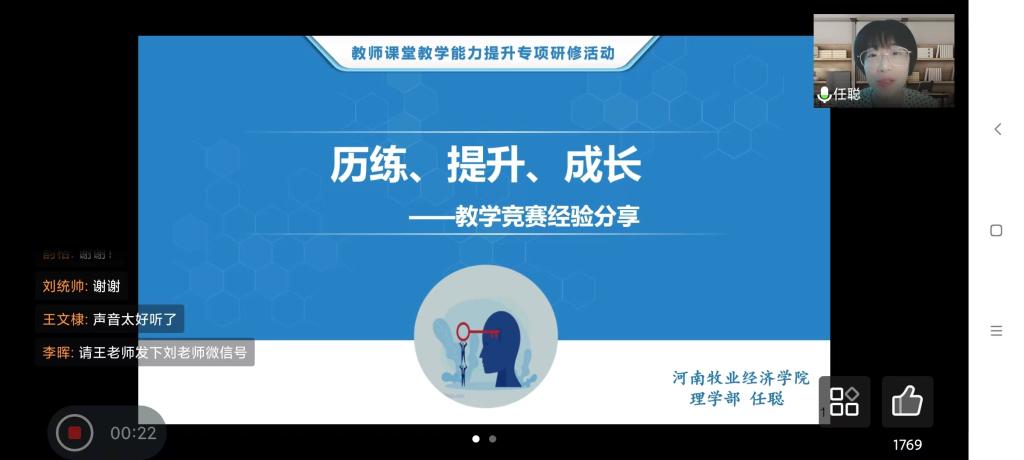 培训为三个主题。首先由全国高校青年教师教学竞赛一等奖获得者,河南师范大学周芳老师,进行《以创新思维打造一流金课以教学竞赛赋能教师成长》的分享。详细解读国赛及省赛比赛方案,通过分析获奖作品提出了高水平课程输出内容的9个方向,毫无保留向教师们传授参赛内容整合、初赛突围技巧、决赛现场技巧等备赛经验。其次,全国高校教师教学创新大赛二等奖,郑州大学刘锦老师分享《教学比赛是提升教学综合能力的催化剂》,最后由河南省高校教师教学创新大赛特等奖,河南牧业经济学院任聪老师进行《历练、提升、成长--教学竞赛经验分享》。