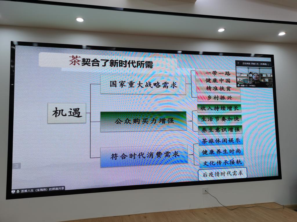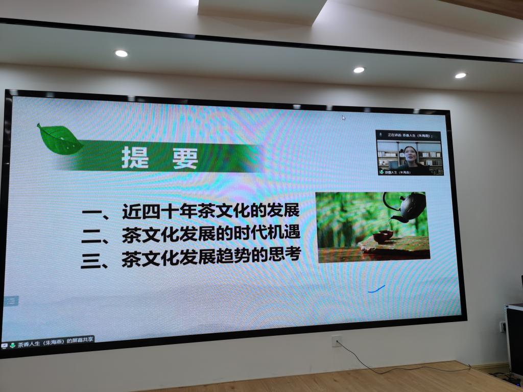 报告会上,朱海燕教授从近四十年茶文化的发展、茶文化发展的时代机遇与茶文化发展趋势的思考三个方面展开论述。通过茶文化社团纷纷成立、茶文化研究成果丰富、茶文化教育空前繁荣、茶文化产业业态多元四个方面展示了近四十年中国茶文化的发展脉络与成果,展现了茶文化的发展现状;从人们对健康美好生活的需求、推动产业转型升级发展的需要、茶成为国际交往舞台的和平使者、茶成为传播中国文化的重要方式、“国际茶日”翻开了“Tea,中国风”的崭新一页五个方面阐述并描绘了茶文化发展的时代机遇;结合茶文化发展现状与时代机遇的论述,朱海燕教授提出了自己对茶文化发展趋势的思考:科技与人文并重、满足人们对美好生活的向往,“茶+”多元融合的跨界产业方兴未艾(衣、食、居、行、人、德、教、医、游),借助创新技术、推动茶文化产业创新发展,沟通世界、助建人类命运共同体。最后,朱海燕教授希望通过茶人们的共同努力,让更多的人知茶、爱茶,共品茶香茶韵,共享美好生活。
