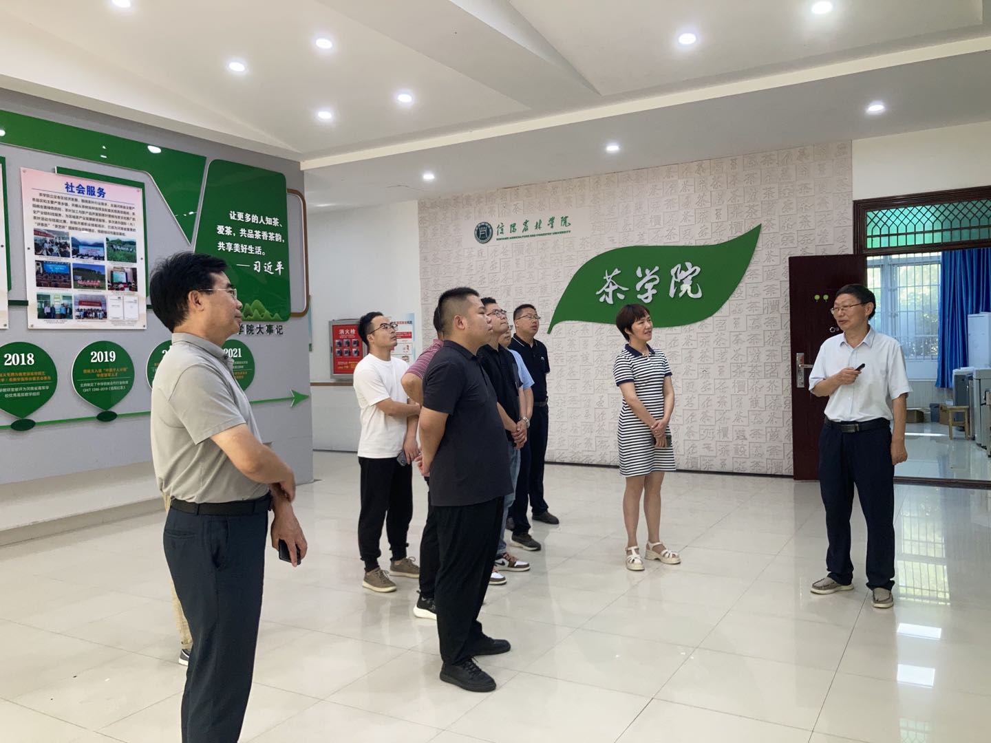 75日上午,固始县科学技术和工业信息化局农村和社会发展股股长杨宝萍、科员常玉松,固始县企业代表河南青峰云雾茶业有限公司王宗廷、河南九华山茶业有限公司朱超、固始县碧雪峰茶业有限公司余科文、信阳十八盘茶业有限公司周其强、河南仰天雪绿茶叶有限公司王章春来茶学院考察调研茶产业研发活动全覆盖产学研合作情况。科技处处长史洪中教授、茶学院院长郭桂义教授、科技处副处长吴海港、茶学院副院长陈义等陪同考察。