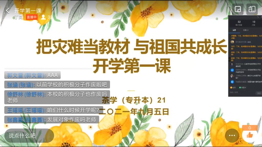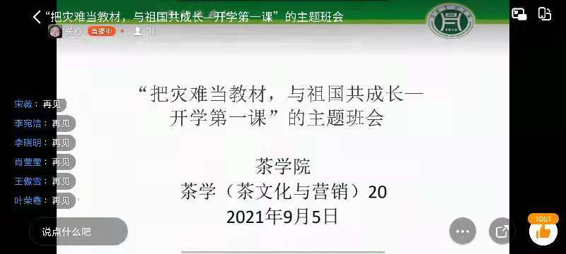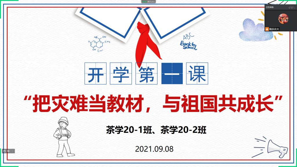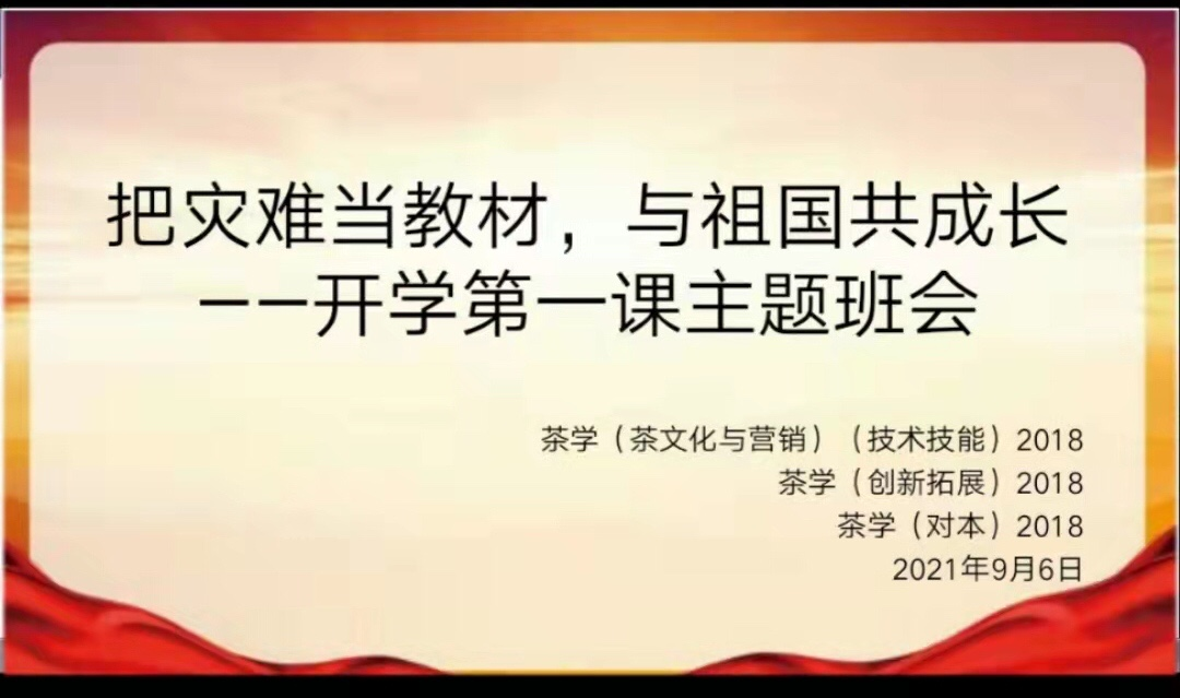 新学期开学在即,茶学院于9月5-8日组织各班分别召开“开学第一课”线上主题班会,化灾难为思想政治教育契机,“把灾难当教材、与祖国共成长”,引导青年学生感悟祖国之伟大,唤起青年责任担当。