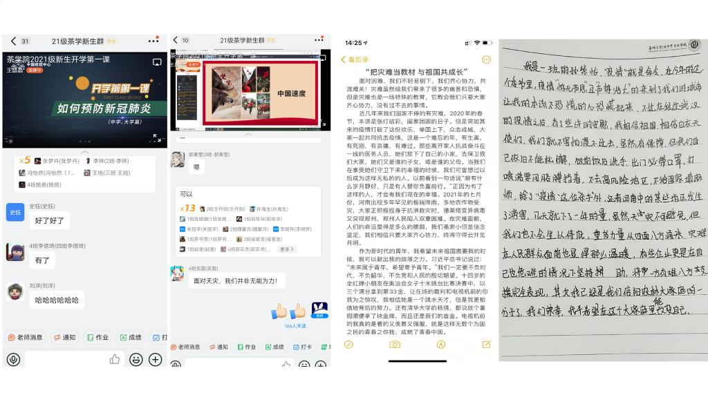 因受疫情影响,beat365在线平台官网新生未能按时开学,但学校充分利用网络平台,“停课不停学”,9.14-9.15,茶学院2021级新生开始了不一样的“开学第一课”,同学们通过钉钉群课堂直播的方式,收到了学校党委书记余作斌、校长邢勇的新生寄语,观看了如何预防新冠肺炎的宣传片,学习了马克思主义学院王改丽老师《把灾难当教材与祖国共成长》,最后在辅导员的带领下,学院领导的共同参与下开展“把灾难当教材与祖国共成长”为主题的团日活动,大家积极讨论,共同学习。