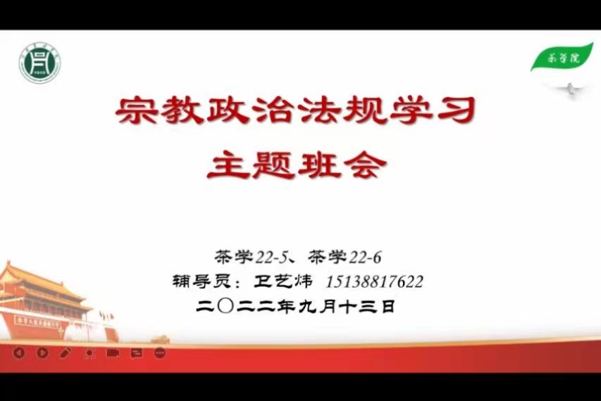 为认真学习贯彻习近平法治思想,全面贯彻党的宗教工作基本方针,积极引导宗教与社会主义社会相适应,引导大学生形成正确的世界观、人生观、价值观,提高大学生价值判断能力,谨防邪教侵害。茶学院2022级各班召开民族宗教理论政策主题班会。