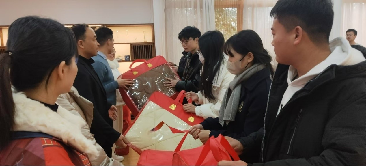 王子浩提醒同学们冬季寒冷,要专注自身专业学习的同时,也要注意防寒保暖。随后,老师们将爱心冬被逐一送到了同学们的手中。这份贴心的礼物承载着学校对学生的殷切希望,也让同学们在寒冷的冬日里感受到学校的温暖与力量。受助学生表示会珍惜学校给予的帮助,化温暖为力量,立志成长成才。