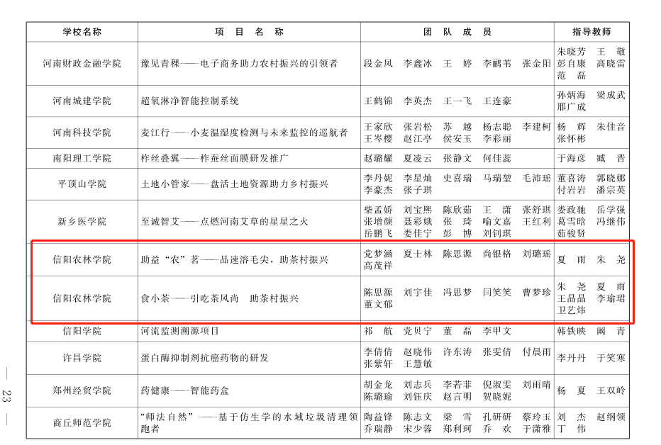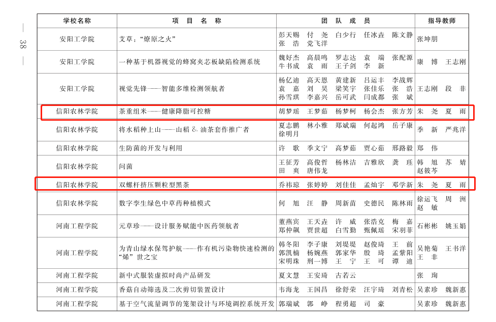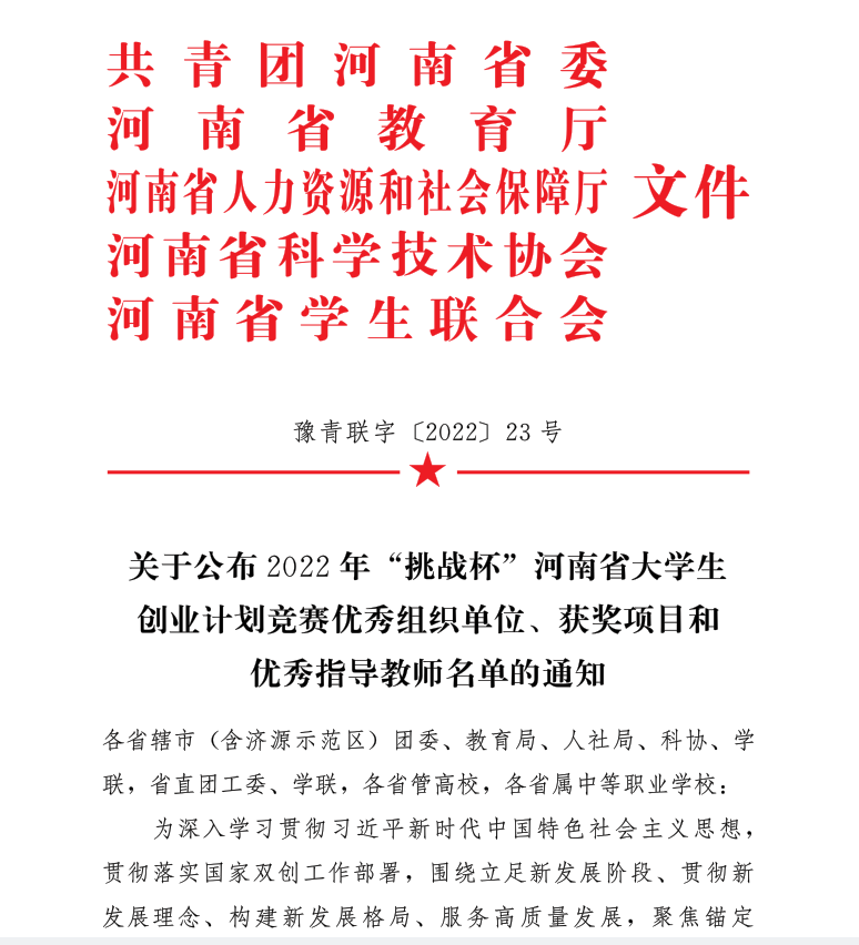 近日,由共青团河南省委、河南省教育厅、河南省人力资源和社会保障厅、河南省科学技术协会、河南省学生联合会共同举办的“2022年‘挑战杯’河南省大学生创业计划竞赛”结果出炉,我院学生参选的《助益农“茗”——品速溶毛尖,助茶村振兴》、《食小茶——引吃茶风尚 助茶村振兴》2个项目荣获竞赛金奖;《茶重组米——健康降脂可控糖》、《双螺杆挤压颗粒型黑茶》2个项目获得竞赛银奖;夏雨、朱尧、王晶晶、卫艺炜四位老师获得优秀指导老师称号。