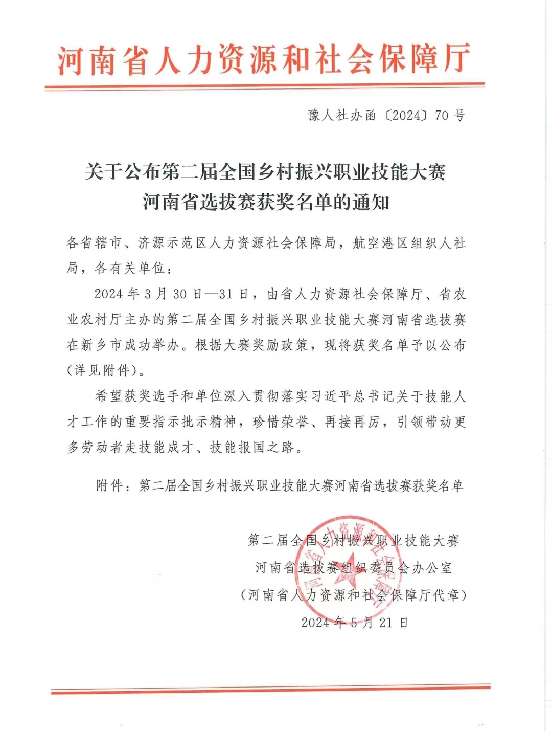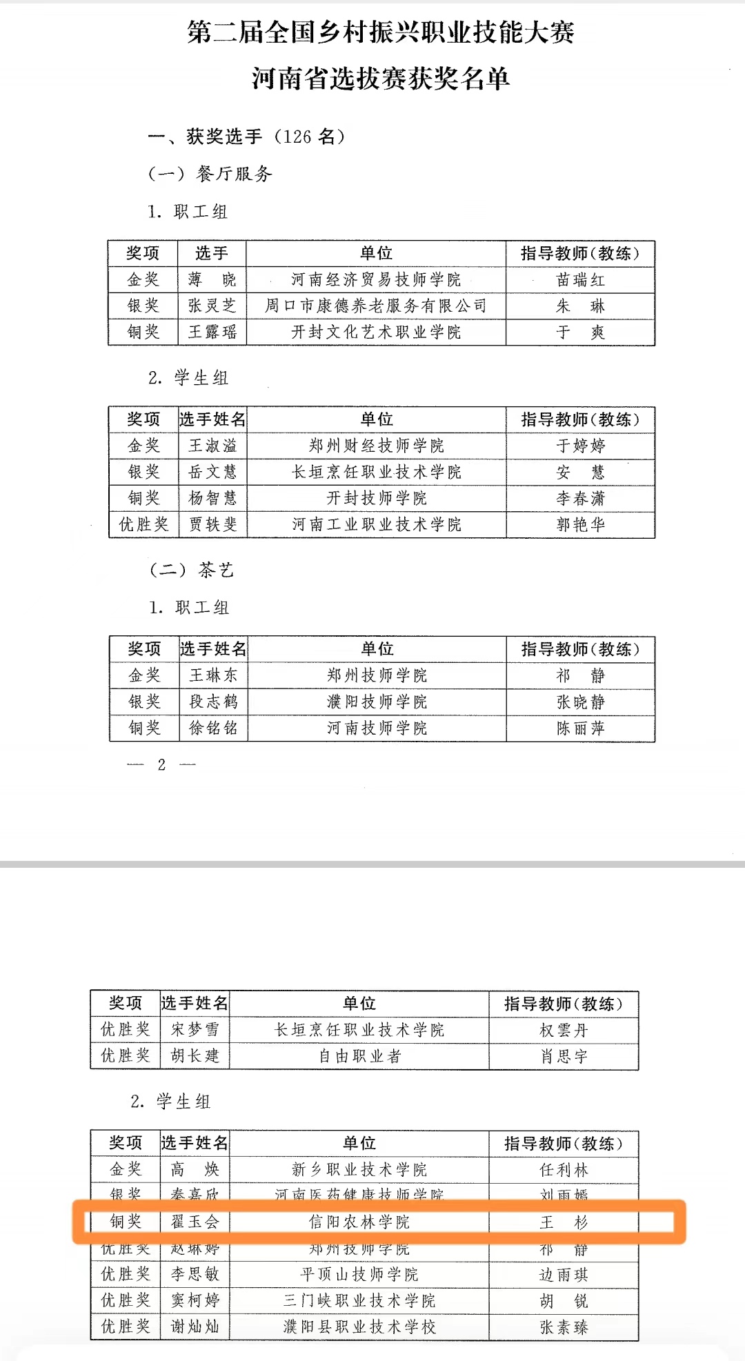 2024330日–31日,由省人力资源社会保障厅、省农业农村厅主办的第二届全国乡村振兴职业技能大赛河南省选拔赛在新乡市举办。根据有关奖励政策,经审核决定,省人社厅521日发文,向翟玉会等126名在2024年度乡村振兴职业技能大赛中取得优异成绩的选手授予“河南省技术能手”荣誉,并颁发荣誉证书和奖章。同时,在本次比赛中,学院王杉老师被评为优秀指导教师,她凭借踏实的工作作风和富有创造性的思维,着眼学生工作的最前沿,走在“学高为师,身正为范”的第一线。