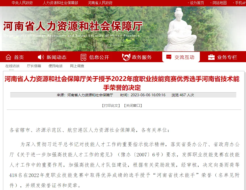 为发挥职业技能竞赛在技能人才工作中的重要作用加强高技能人才队伍建设根据有关奖励政策经审核决定,省人社厅66日发文,彭安琪418名在2022年度职业技能竞赛中取得优异成绩的选手授予"河南省技术能手"荣誉并颁发荣誉证书和奖章。
