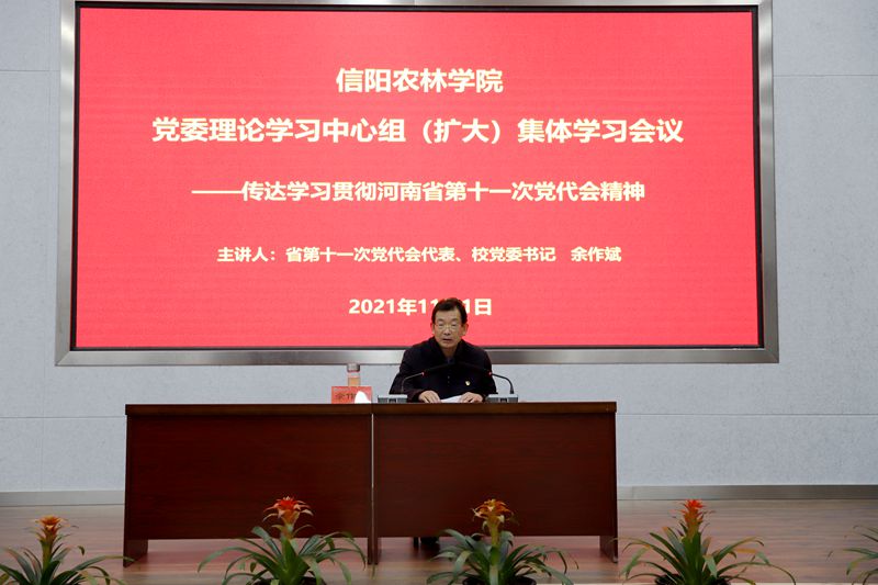11月1日下午,河南省第十一次党代会代表、校党委书记余作斌主持召开党委理论学习中心组(扩大)集体学习会,传达学习中国共产党河南省第十一次代表大会精神,并就贯彻落实好党代会精神进行安排部署。校党委委员、全体中层正职干部参加会议。