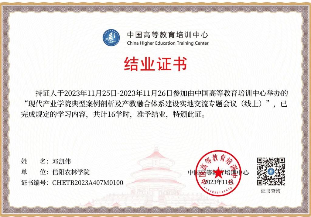 2023年11月25日—26日,由中国高等教育培训中心主办,师培联盟 (北京) 教育科技研究院协办的现代产业学院典型案例剖析及产教融合体系建设培训会交流专题会议在安徽芜湖举行,动物科技学院副院长邓凯伟通过线上方式参加了本次专题会议。