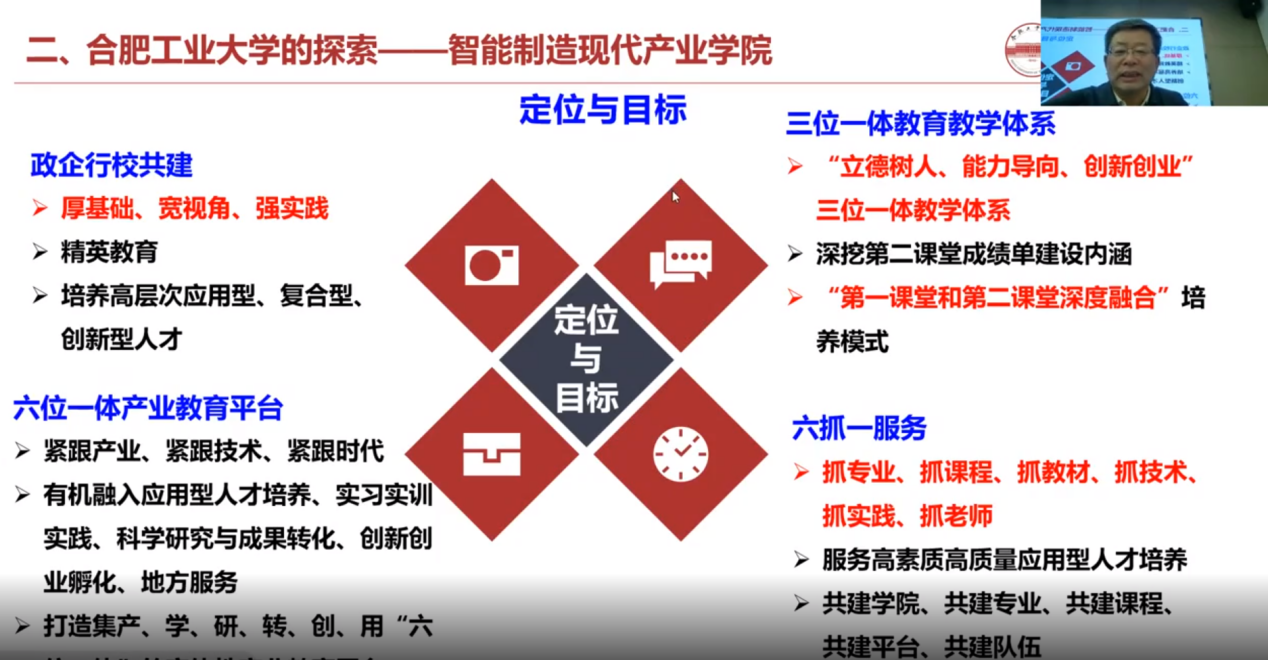 会议邀请深圳大学杨炬、合肥工业大学刘志峰、 东莞理工学院胡耀华、南京师范大学杨继全、安徽工程大学许德章分别进行《新一代人工智能人才培养实践一以腾讯云人工智能特色班为例》《深化产教融合,培养高素质人才》《集聚资源 服务产业 培养人才》《建设现代产业学院推进产教融合发展》《构建校地和校企协同育人新格局,丰富机器人现代产业学院建设内涵》的主旨报告。