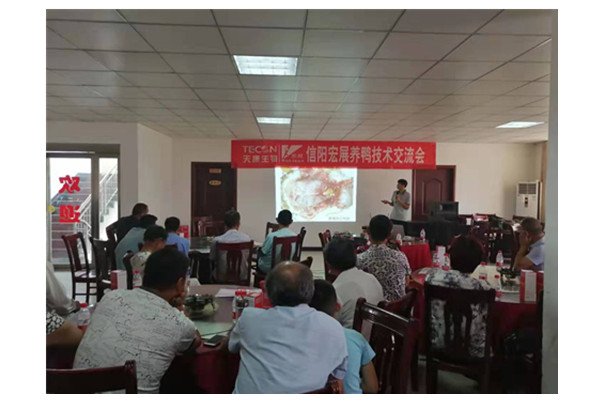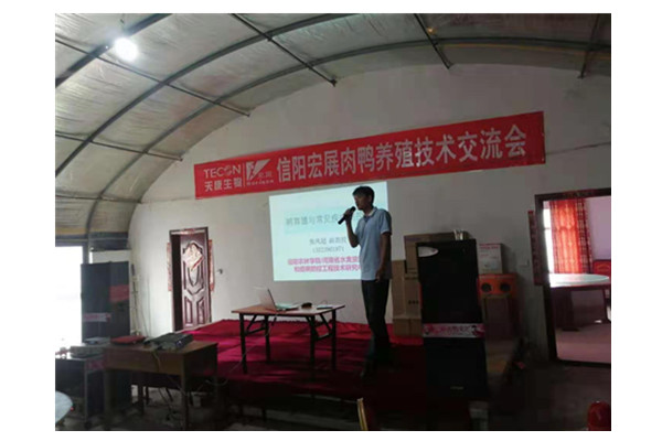 2019 年7月9-10日和7月13-14日,牧医工程学院动物检疫科技服务团队焦凤超、徐光科、李迎晓和易本驰等老师应信阳宏展实业有限公司邀请,到息县开展水禽养殖和疫病防控技术专题培训,团队成员就肉鸭和蛋鸭养殖过程中关键技术环节(育雏、体重管理和光照控制)和常见疾病如禽流感、鸭病毒性肝炎、鸭呼肠孤病毒病毒感染、鸭疫里默氏杆菌病和大肠杆菌病等疾病的发病特点、防治措施进行了详细的讲解,并对养殖户提出的问题进行了现场解答和交流。