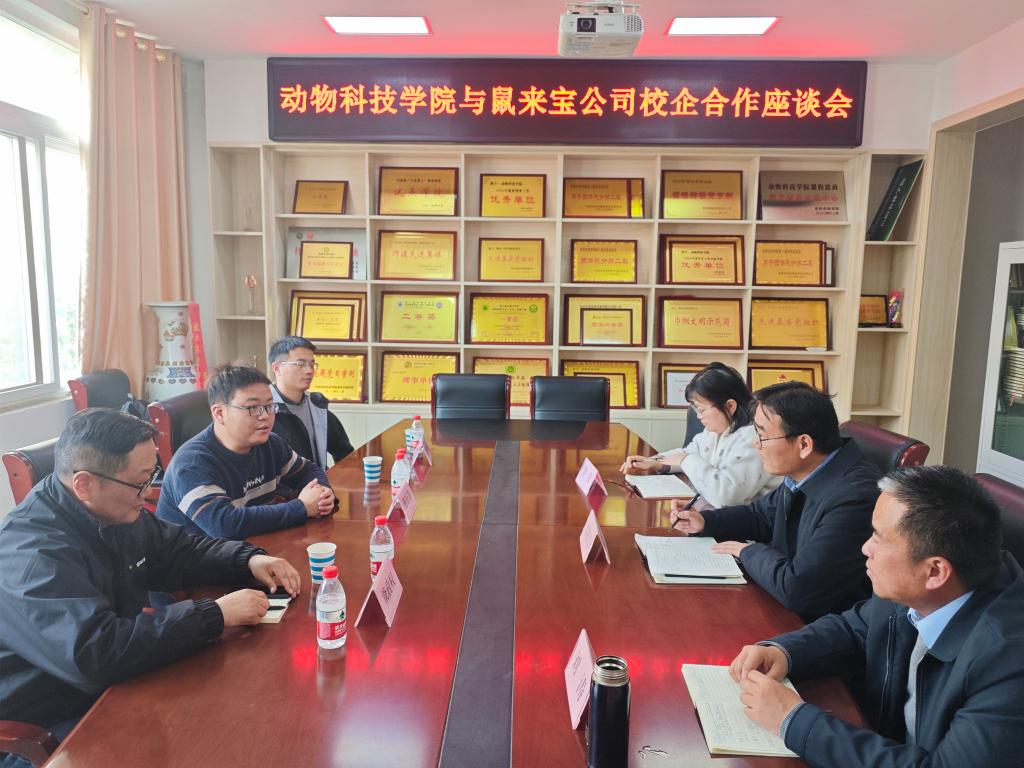 会后,校企双方在动物科技学院会议室举行合作座谈会,围绕人才培养、科研项目联合攻关及资源共享等议题展开交流,并就共建学生实习基地达成初步意向。院长邓凯伟代表学院衷心感谢曹云飞副总裁为学院师生带来的精彩报告,并表示学院将积极与鼠来宝集团开展多层次的合作,充分发挥双方优势,共育专业人才。