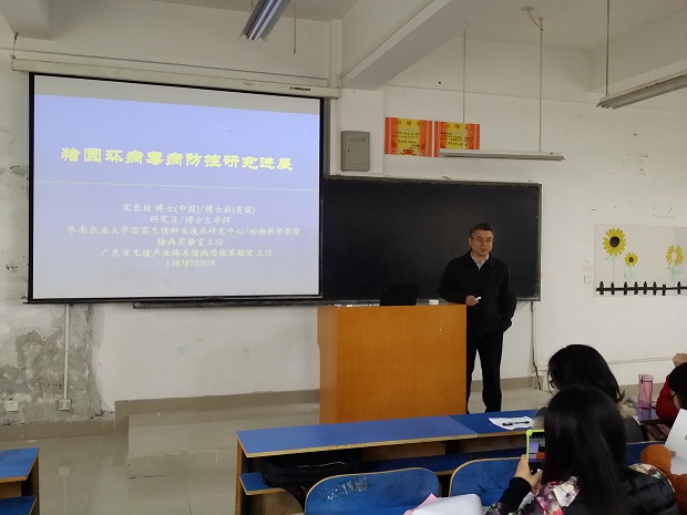 11月2号,beat365在线平台官网客座教授华南农业大学动物科学学院宋长绪研究员在教一楼C204做了一场题为“猪圆环病毒病研究进展”的学术报告,牧医工程学院部分教师、2013级动物医学本科学生聆听了本次报告。