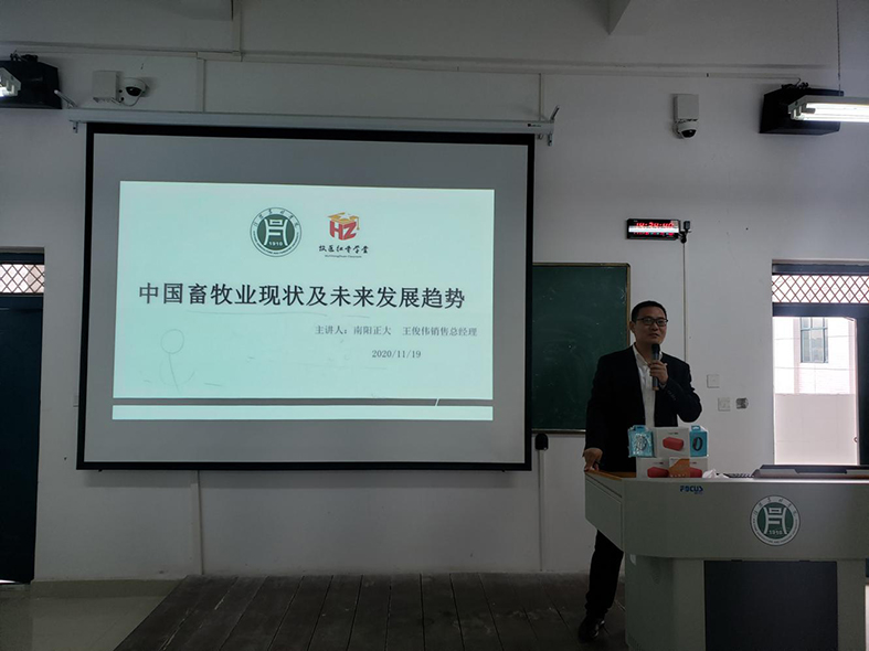11月19日下午,正大集团河南区的优秀代表,南阳正大的销售总经理王俊伟为牧医工程学院学生做了题为《中国畜牧业现状及未来发展趋势》的讲座,18级动物医学和18级动物科学为主的院内学生参加了讲座。