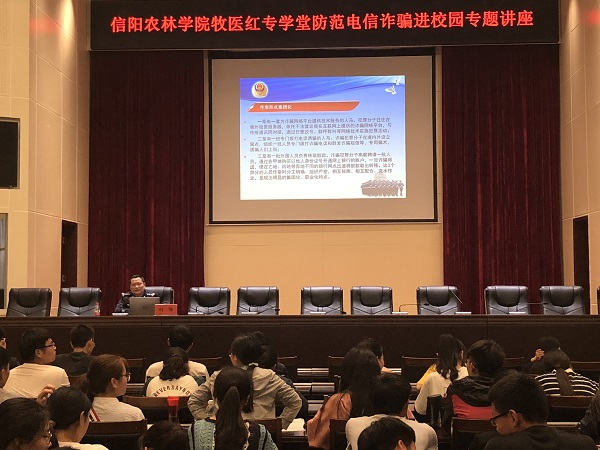 近年来,大学生遭遇电信诈骗事件屡见不鲜,大学生成为电信诈骗的高发群体。为进一步加强我院学生防骗、识骗意识和能力,预防和减少诈骗案件的发生,4月3日,牧医红专学堂第二讲邀请信阳市公安局反诈中心时翔主任,在图书馆报六楼给全院大一新生做了一场题为 “大学生如何防范电信诈骗”的专题报告会。