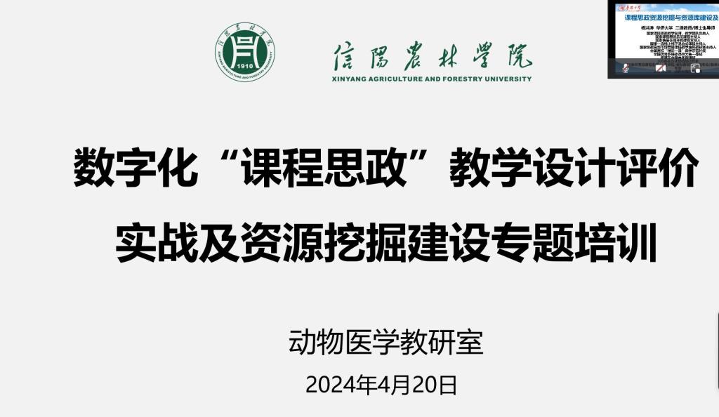 为全面落实立德树人根本任务,帮助教师课程思政资源的数字化转化和共享,掌握课程思政的基本理念和实施方法,有效挖掘课程思政的教学要素,准确把握课程思政的数字化实施路径,进一步增强教师课程思政教学设计评价能力,提高课堂教学育人水平,全面推进课程思政建设,4月20-21日,动物医学教研室组织全体教师线上参与数字化“课程思政”教学设计评价实战及资源挖掘建设专题培训。