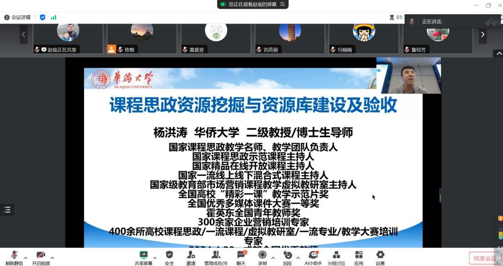 培训第一部分,华侨大学杨洪涛教授从“做什么”、“怎么做”、“怎么做好”三个方面展开讲述了“课程思政资源挖掘与资源库建设——以国家课程思政示范课程为例”。杨洪涛以国家课程思政建设为背景,介绍了习近平总书记关于课程思政的指示精神,解读了教育部《全面推进高校课程思政高质量建设》等文件,并以自身课程思政工作经历为例,分享了课程思政项目获奖经验以及课程思政课程背景与设计。
