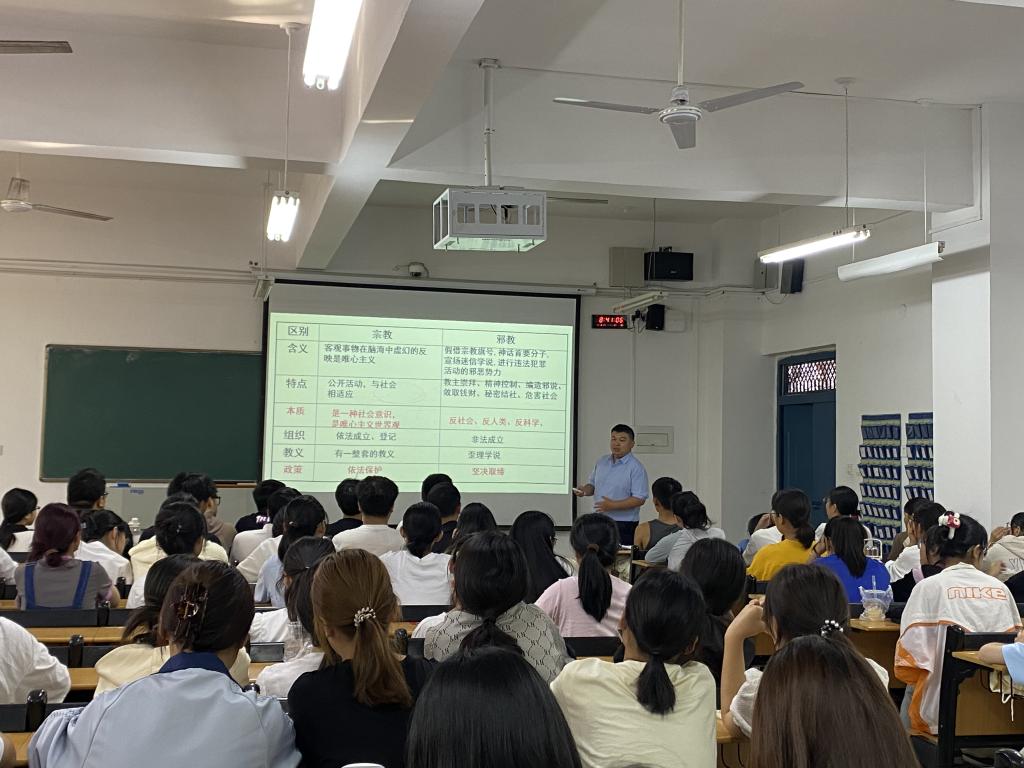 9月26日上午,办公室主任陈明睿为新生开展“高校民族宗教知识”专题培训。