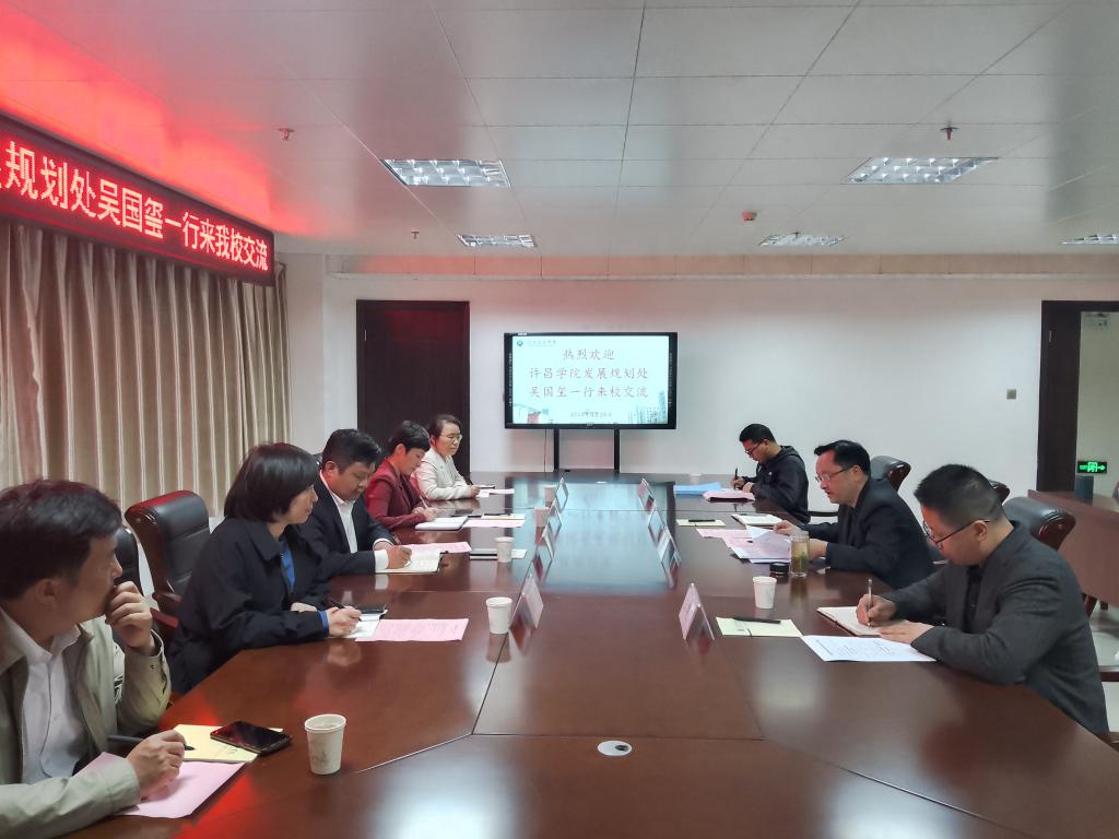 2023年4月28日下午,许昌学院发展规划处处长吴国玺等一行五人前来beat365在线平台官网考察交流。beat365在线平台官网发展规划处在行政楼三楼第五会议室与来宾进行了座谈交流。
