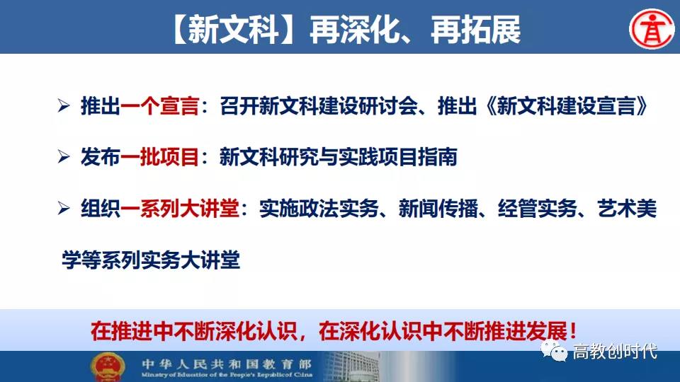 吴岩要求,要走一条新路,加快推进新医科建设、深化新工科建设、积极推进新文科建设、持续推进新农科建设。要下一盘大棋,办好第六届“互联网+”大学生创新创业大赛,举办世界慕课大会、持续推动人才培养范式变革和“学习革命”深入开展。要布一个大局,推进新时代中西部高等教育振兴。要推一组大招,深入推进高校课程思政建设、推进一流课程建设“双万计划”、启动“基础学科拔尖学生培养计划2.0”基地遴选,努力打好打赢全面振兴本科教育攻坚战。