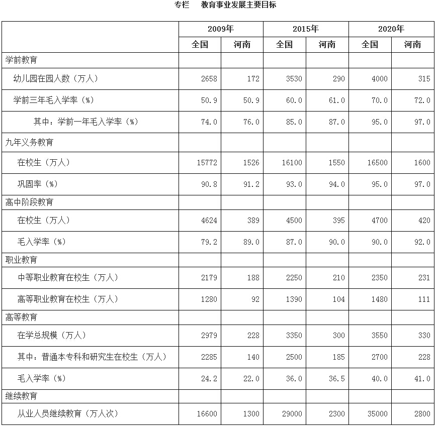 河南省中长期教育改革和发展规划纲要(2010-2020年)
