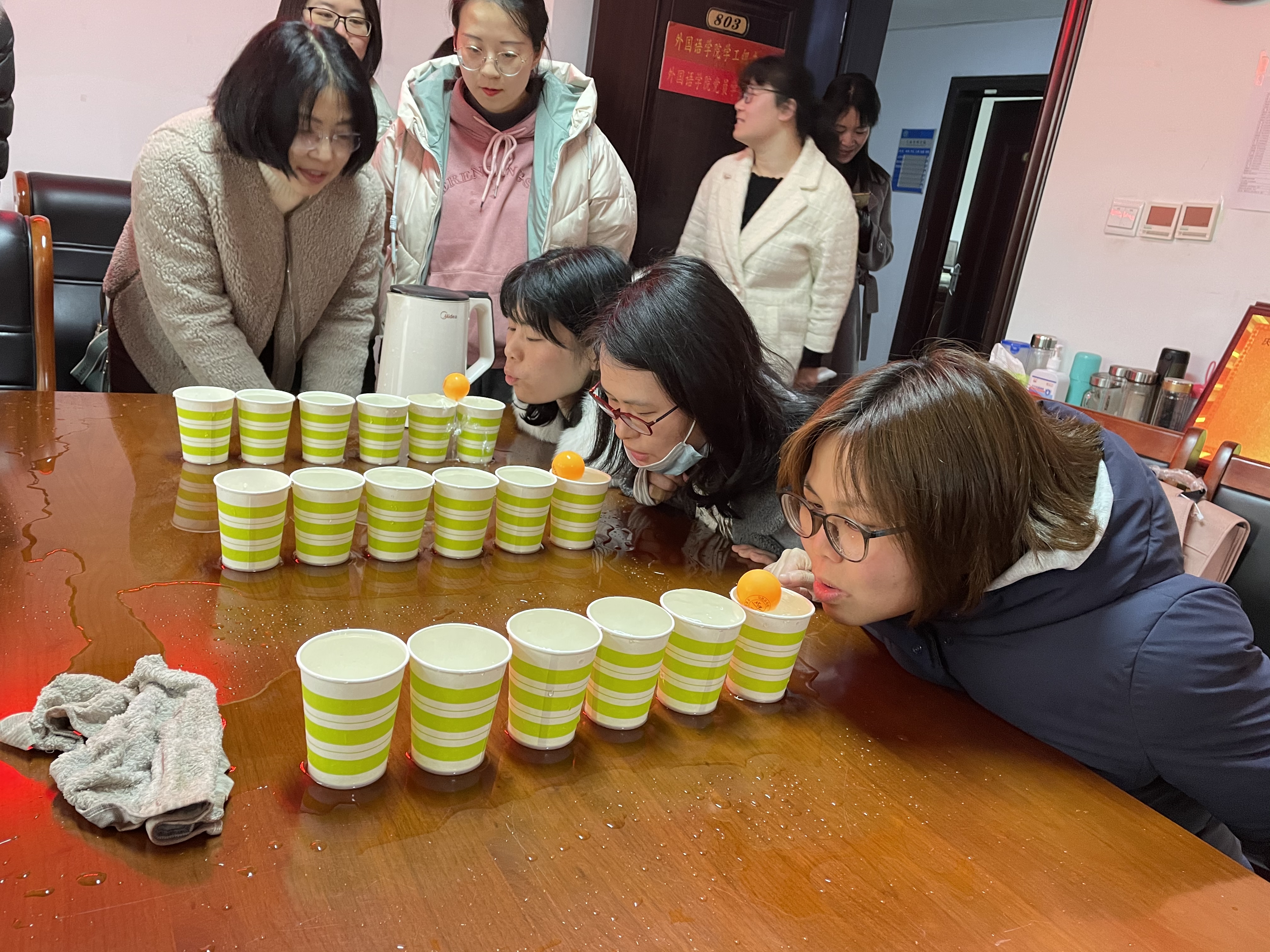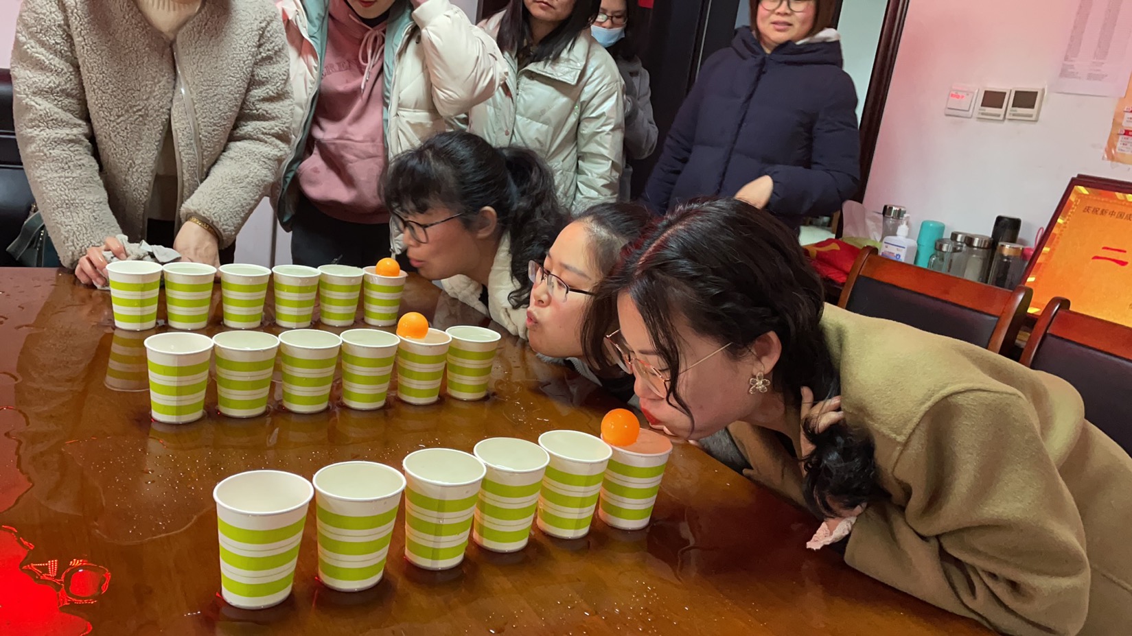 本次活动以“翻山越岭”小游戏为主,分工会教师们轮流进行比赛。三位老师同时开始,在不接触乒乓球的情况下将其从第一个盛满水的纸杯中吹向最后一个,先到达最后纸杯中的老师则为获胜者。在游戏期间,若乒乓球掉落,便要重新放回第一个纸杯,从头开始。