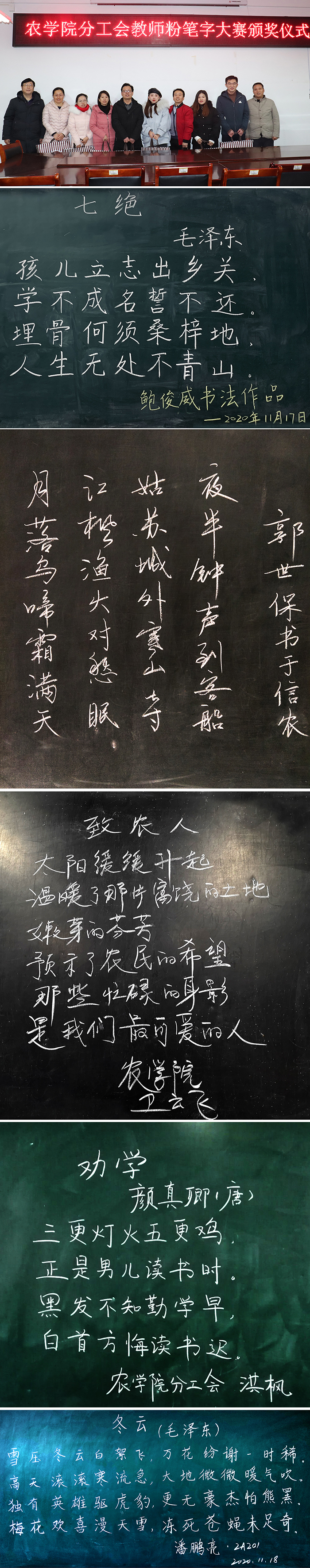 为了丰富教职工的文化生活,切实提高教师板书技能水平,农学院分工会举行了以“书写精彩人生,筑梦三尺讲台”为主题的粉笔字大赛,全院教职工积极参加。