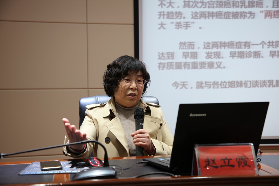 赵主任从专业角度出发,用生动形象的语言、详实经典的案例,针对乳腺癌、宫颈癌等妇科常见疾病,向大家介绍了疾病的发现和预防相关知识,还就更年期女性健康问题与在场听众进行交流。她倡导女性关注自身健康,养成定期体检的习惯,做到有病早发现、早治疗、早康复,学会正确调适情绪,合理释放工作、生活中的压力,用健康的体魄和积极的心态去创造美好的生活。