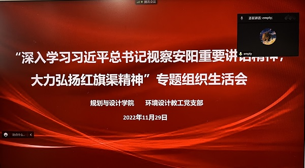 11月29日,环境设计教工党支部召开“深入学习习近平总书记视察安阳重要讲话精神,大力弘扬红旗渠精神”专题组织生活会,本次组织生活会采取线上形式,全体党员参加,会议由党支部书记张志锋主持。