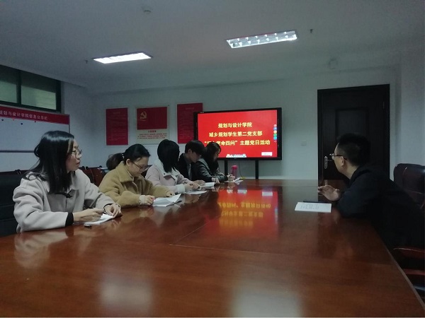 规划与设计学院城乡规划学生第二党支部于2019年11月19日下午,在规划与设计学院党员活动室702举行了以“初心使命四问”为题的党日活动。本次会议由党支部书记余丰同志主持,学生党员参加。