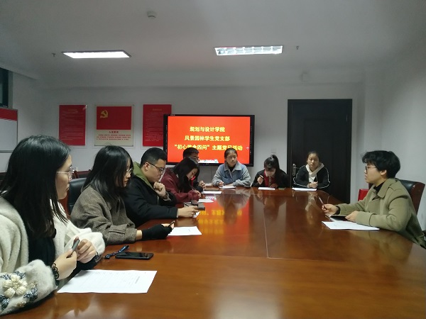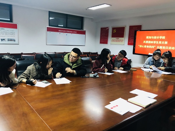 为了推进“不忘初心,牢记使命”主题教育深入开展,规划与设计学院风景园林学生党支部于11月19日下午在党员活动室702开展“初心使命四问”主题党日活动,支部全体党员参加,活动由党支部书记杨丽娜主持。
