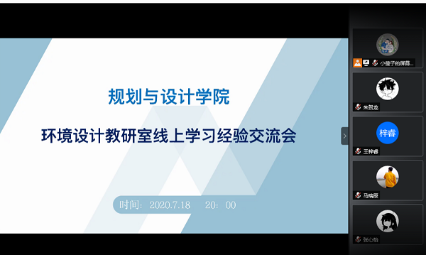 为了帮助2018级同学进行学业提升,增强同学们的自信心和学习动力,环境设计教研室于7月18日晚举办了一场特殊的线上学习经验交流会。教研室老师张志锋、徐曼、万莹、蔡雨希参加会议,参会学生100余名。