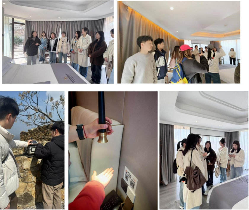 河南省信阳市吉小象何家寨露营基地位于信阳市浉河区浉河港乡郝家冲村,是集旅游观光、休闲体验、商务度假、山体户外运动、亲子活动为一体的旅游综合体。该项目是浉河区委区政府打造的乡村振兴示范样板工程,整体围绕“以茶促旅、茶旅融合”的发展战略,除了融合和与恢复当地的山景等自然资源、古山寨等人文资源,还植入了部分山体户外运动、游乐、养生等特色旅游设施。基地占地约530亩,包括游客服务中心、生态停车场、云崖古堡、研学基地、观星台、茶绿栈道等建筑,其中民宿区是中原地区最大的特色帐篷住宿群。全体师生在基地工作人员王瑞阳的带领下参观了基地,为同学们介绍了项目政策背景、运营模式、基地环境照明规划、室内与景观照明设计理念以及山地施工重难点等内容。随后,在授课老师的指导下,同学们分组以“山地露营”为主题,通过随机访谈、实地测绘等方式,对基地不同区域的照明设计进行了详细调研。