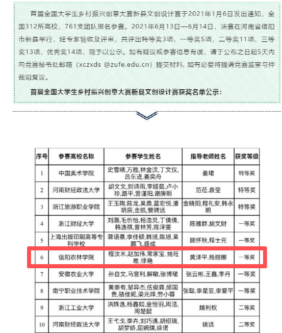 2021年6月14日,首届全国大学生乡村振兴大赛新县文创设计赛决赛在河南省新县举行。来自全国27个省(市、自治区、特别行政区)312所高校、近1万5千名学生、761支团队参加比赛。经专家验收及评审,共评出特等奖3项,一等奖5项,二等奖11项、三等奖13项,优秀奖14项。我院“田铺大塆整体IP设计”团队在比赛中披荆斩棘,荣获一等奖。
