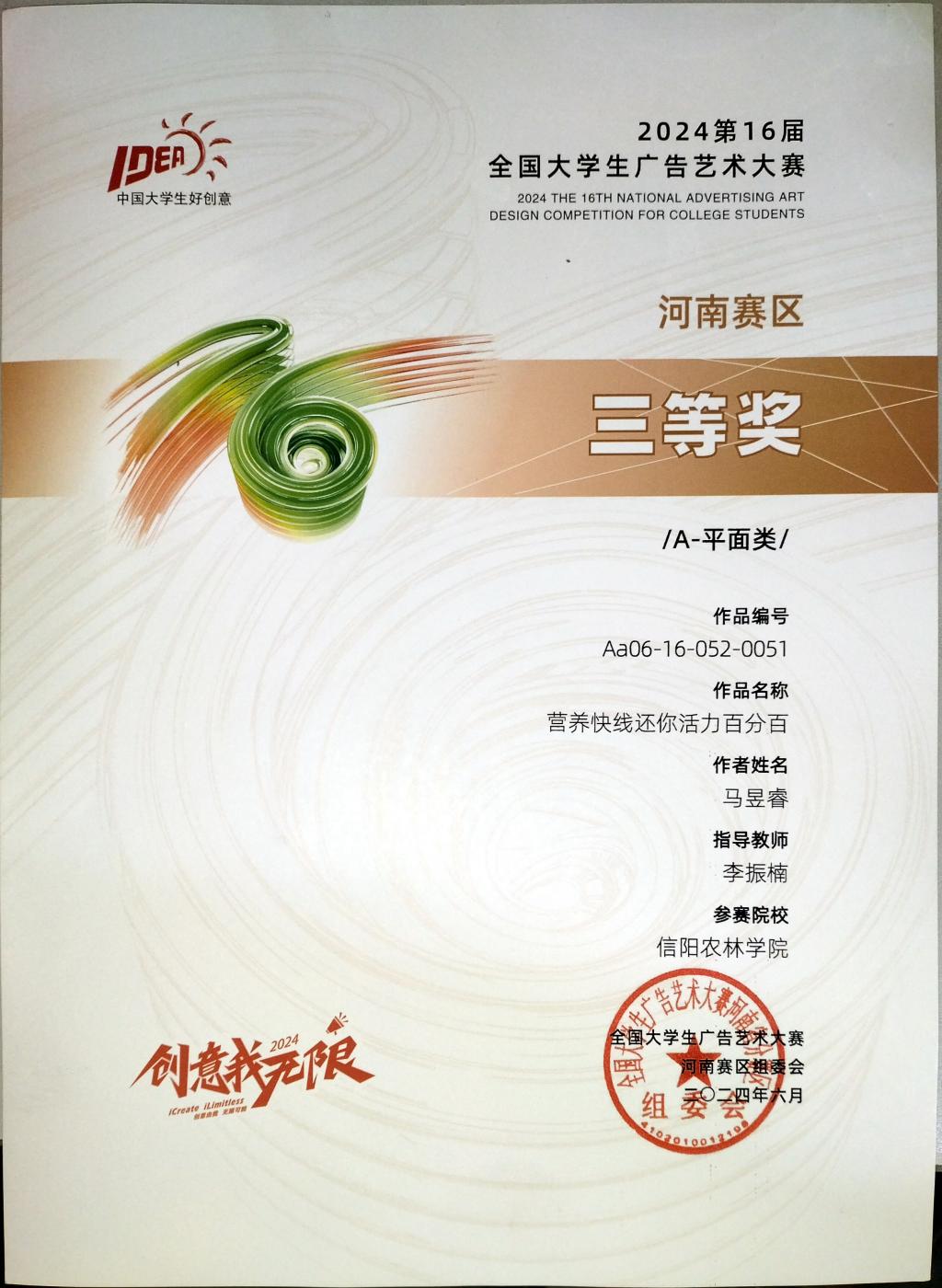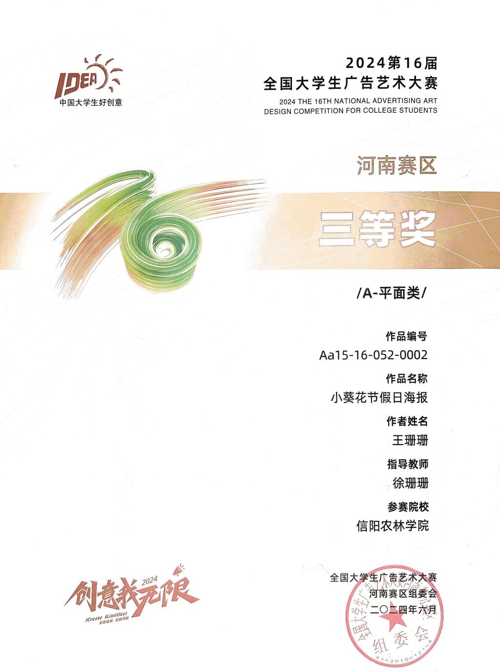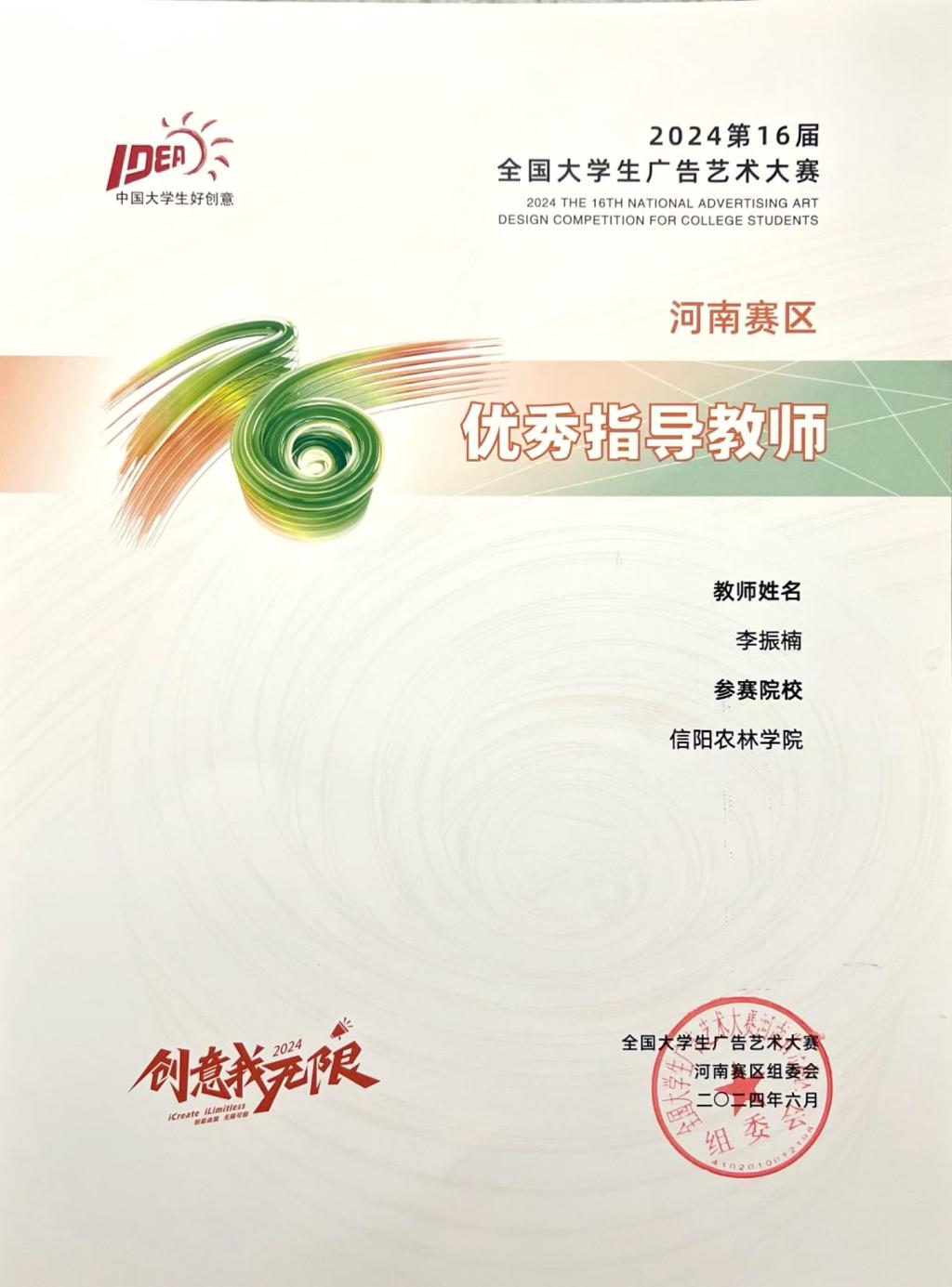 第十六届全国大学生广告艺术大赛获奖名单揭晓,我院视觉传达教研室教师孙征、徐珊珊、李振楠指导的21级、22级视觉传达设计专业的解宇辰、石辉婷、马昱睿、王珊珊的设计作品荣获河南赛区二等奖和三等奖,孙征、李振楠荣获优秀指导教师奖。