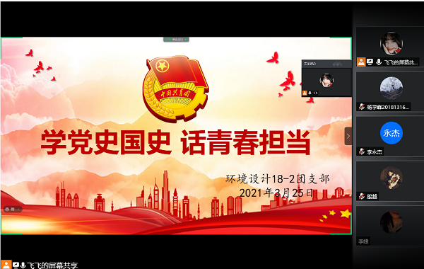 为进一步提升同学们的政治素养,使其深刻了解党和国家的奋斗历程,规划与设计学院团总支各团支部采用线上线下结合方式,于3月25日、3月26日分别在二教教室和腾讯会议开展了以“学党史国史 话青春担当”为主题的团日活动。