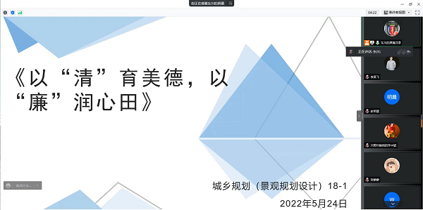为深入贯彻落实全国高校思想政治工作会议精神,帮助毕业生系好人生“第一粒扣子”,规划与设计学院各毕业班辅导员采取线上线下相结合的方式,于2022年5月24日纷纷召开“以‘清’育美德,以‘廉’润心田”2022届毕业生廉洁教育主题班会。