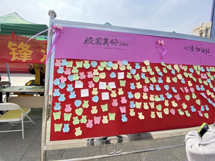 本次活动分为“校园美好”和“心情加油站”两个板块。“校园美好”分享活动,利用便利贴,将自己在校园中遇到的暖心事分享下来,对帮助过自己的那个人说一句谢谢,可以提及对方的全名也可以用“张同学、刘老师”或“陌生人”代替,如:“感谢张同学在期未分享给我的学习笔记,在此向你说声感谢!”或“刘老师,谢谢您在我迷茫的时候给予我的帮助!”等,内容要健康向上,可以署自己的名字或昵称。心理健康部同学负责将同学们的分享贴在展板上。“心情加油站”分享活动由心理健康部摆放展台,同学们可以前往分享自己的心情,说说近期遇到的开心或者不开心的事,分享快乐或一起打开心结。