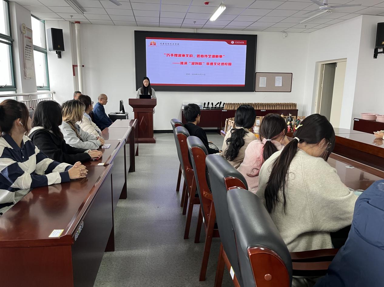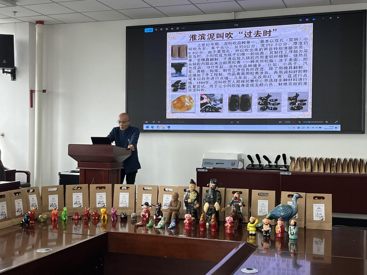 为深入贯彻落实习近平文化思想,彰显信阳优秀传统文化的独特魅力,培养德美艺美的时代青年,10月31日下午,我院在文学艺术楼702会议室开展“巧手捏泥承文韵,匠心传艺谱新章”——淮滨“泥叫吹”非遗文化进校园主题活动。活动由学院团委副书记黄慧慧主持,近70名师生代表参加。