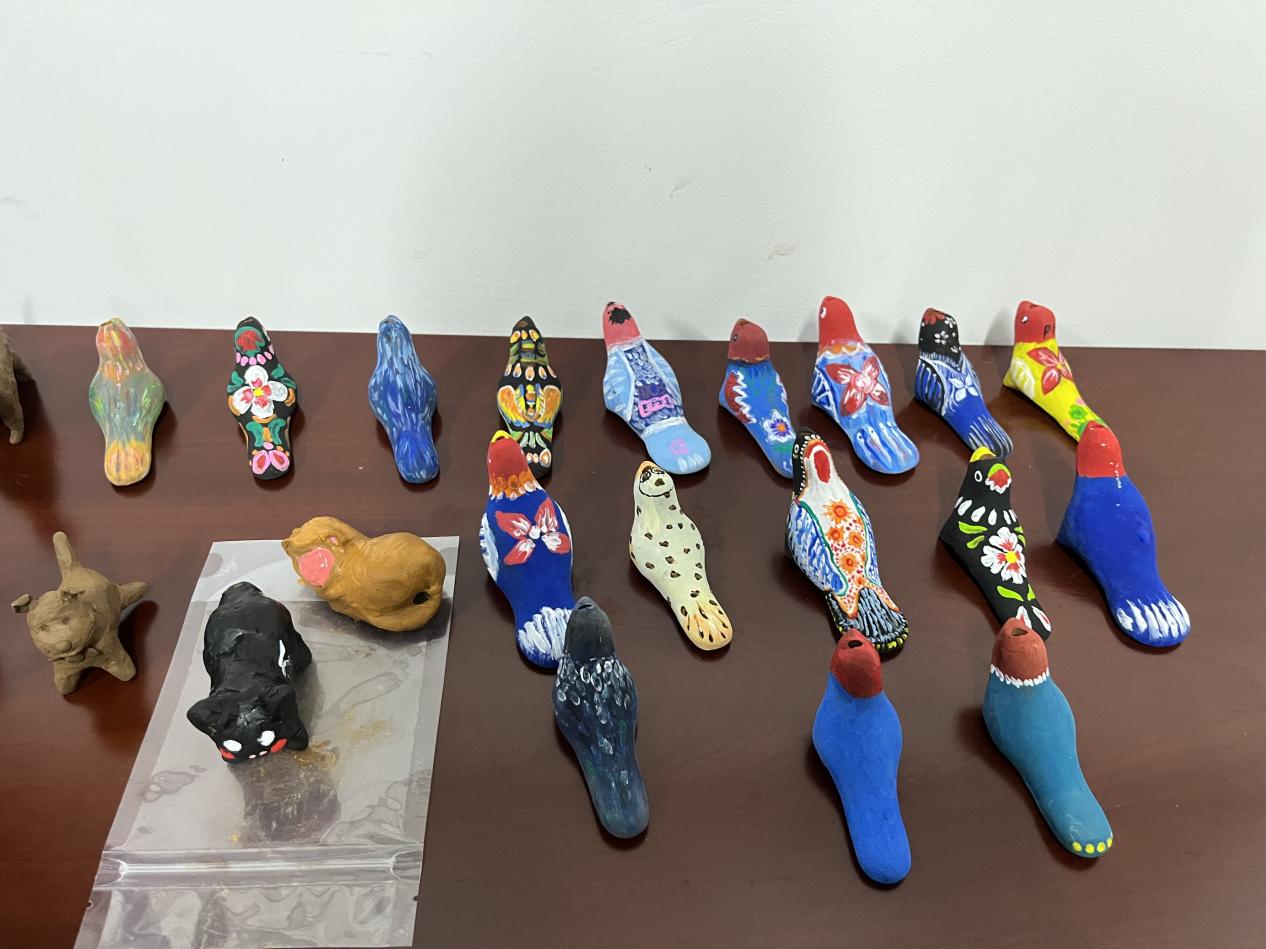 活动伊始,黄慧慧向在场师生隆重介绍了非遗传承人郑金宇老师。同时她指出,非遗文化不仅是中华民族的文化根脉,其蕴含的思想观念与人文精神更是涵养文化自信的重要源泉。活动分为非遗宣讲、亲身体验两个环节,非遗传承人郑金宇首先围绕淮滨“泥叫吹”的发展脉络、歌谣寓意、泥塑制作工艺(捏制、雕刻、彩绘、钻孔等)与细节刻画等方面进行了系统讲解。随后,郑老师指导同学们进行非遗泥塑捏制和彩绘体验,引导学生们认真捏塑胶泥、精心刻画细节,同学们结合专业所学进行彩绘,创作出一个个形态各异、色彩丰富、哨声清脆有创意的“泥叫吹”作品。期间,同学们纷纷表示此次体验活动,不仅深入了解了淮滨“泥叫吹”的文化内涵与价值,也更加明确传承非遗不仅是守护文化根脉,更是为专业学习与创新汲取灵感的重要途径。