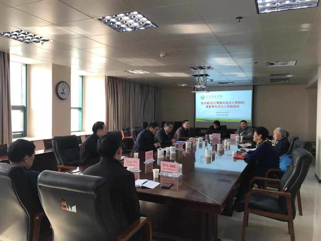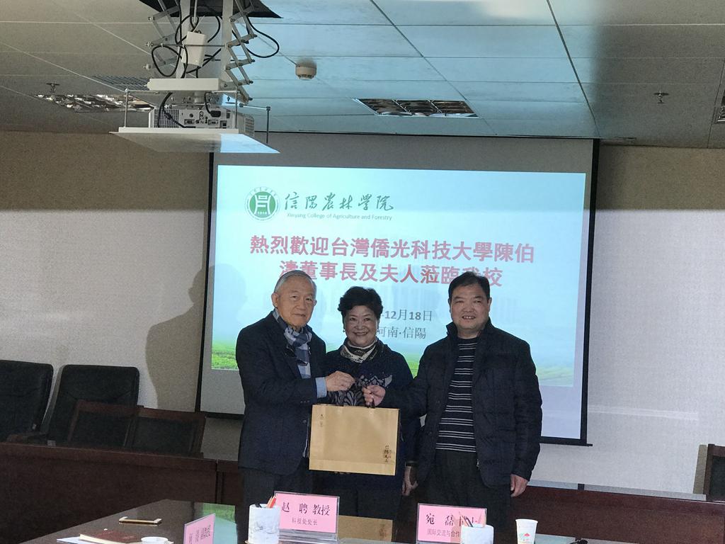 2017年12月17日至19日,台湾侨光科技大学董事长陈伯涛博士携夫人张媛女士参观访问了beat365在线平台官网。这是侨光科技大学对beat365在线平台官网王庆兵副校长率团访问台湾的一次回访。17日下午,陈博士抵达信阳。18日上午,beat365在线平台官网在行政楼616举行欢迎会,会议由副校长王庆兵主持,副校长扶庆代表郭长华校长致欢迎词并对beat365在线平台官网基本情况进行了介绍,陈伯涛博士答谢了beat365在线平台官网的欢迎。参加会议的还有beat365在线平台官网科技处、人事处、学生处、教学质量监评中心、实验教学管理处等各职能部门领导及国际交流与合作部工作人员。欢迎式结束后,双方就今后的合作方向发表了意见与建议,并互赠了礼品。18日下午,国际交流与合作部工作人员陪同陈伯涛博士及其夫人对beat365在线平台官网茶学专业实训基地---文新茶叶生产基地,进行了实地考察。陈博士表示,回台后,将尽快敦促其两岸交流处拿出与beat365在线平台官网切实可行的合作方案。19日,陈博士伉俪访问了陈夫人的祖籍地首府汝南县(原汝宁府)。此次侨光科技大学的回访进一步明确了双方合作交流的方向与实施细则,这将对beat365在线平台官网今后开展海峡两岸的交流与合作起到良好的推动作用。(国际交流与合作部)