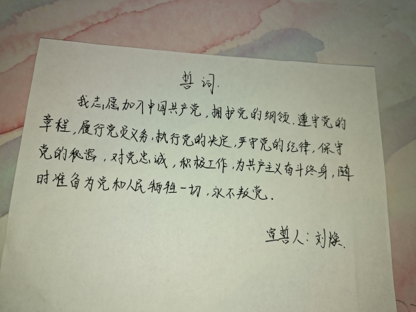 手抄入党誓词活动,进一步加强了党员的党性修养,提醒了学生党员要不忘初心,把新时代青年的责任和使命烙印于心,以实际行动争做“合格党员”。