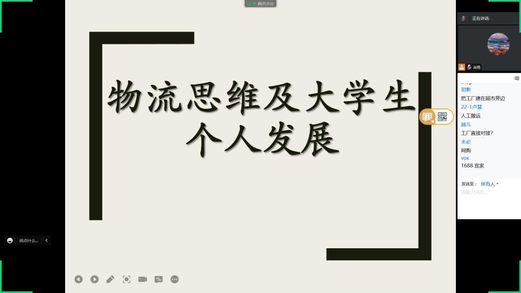 为加强2022级新生对专业的认知,帮助学生尽快融入大学生活,明确今后努力的方向并确定合理的目标,2022年9月17日上午,物流管理教研室组织2022级物流管理专业全体新生在腾讯会议召开了一场题为《物流思维及大学生个人发展》的专题讲座。讲座由物流管理教研室主任尚扬老师主持。